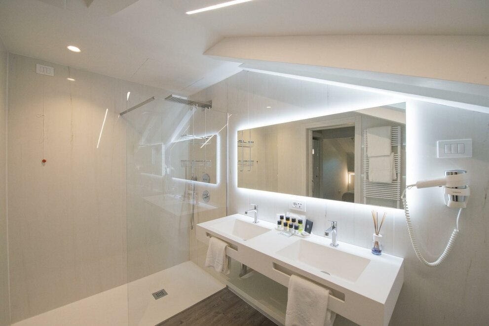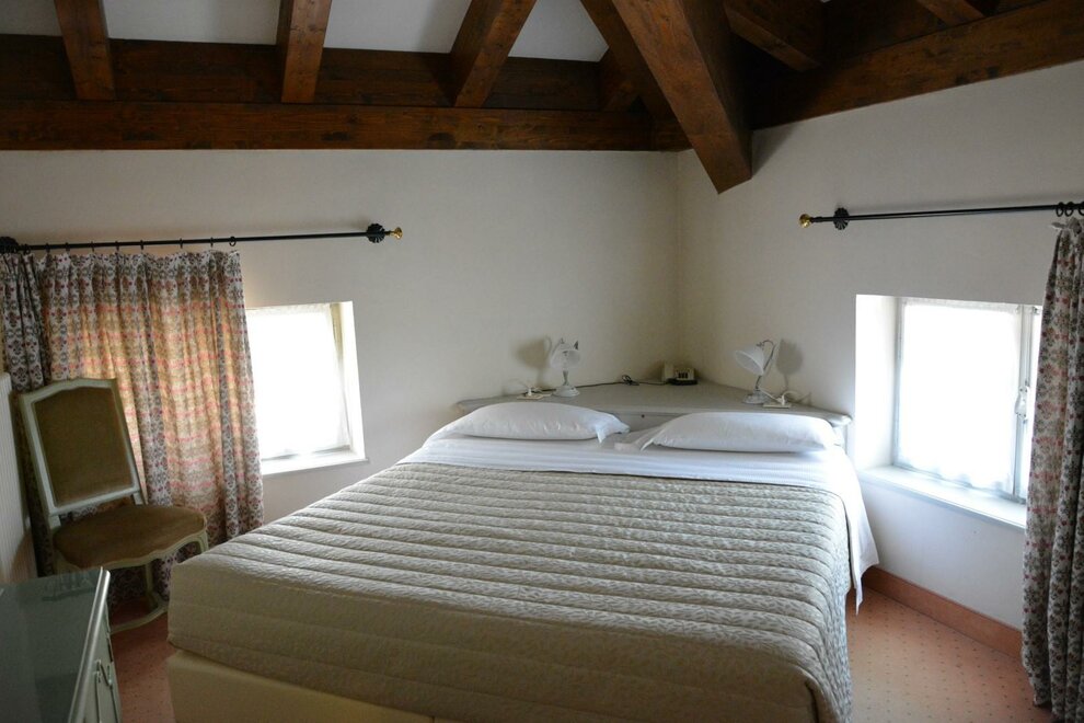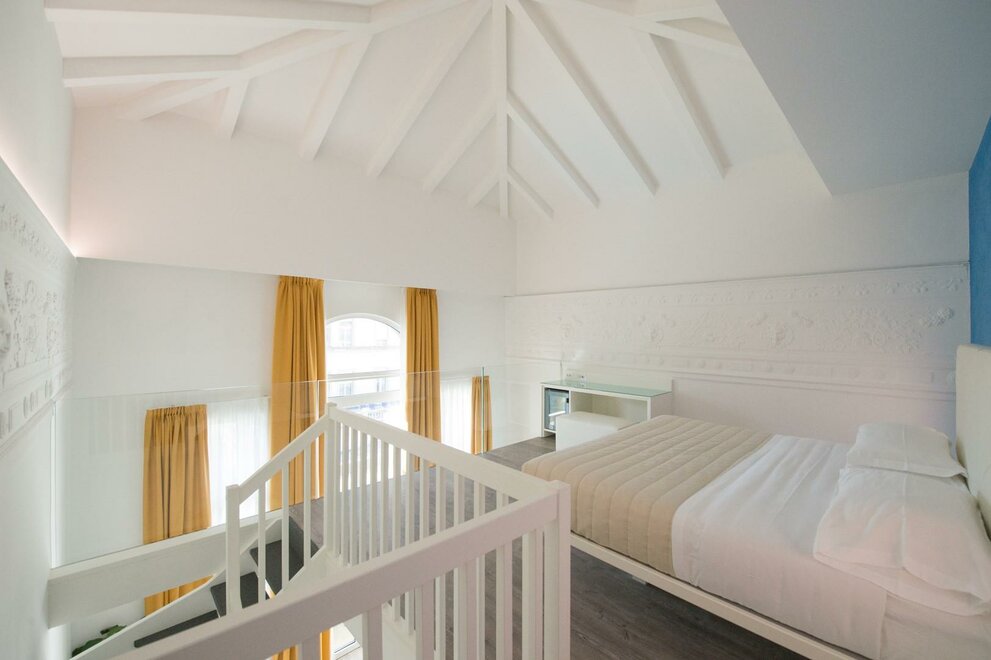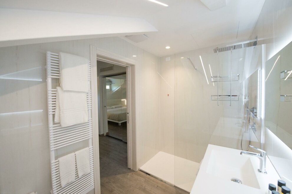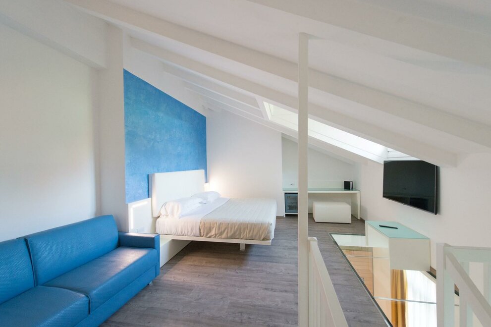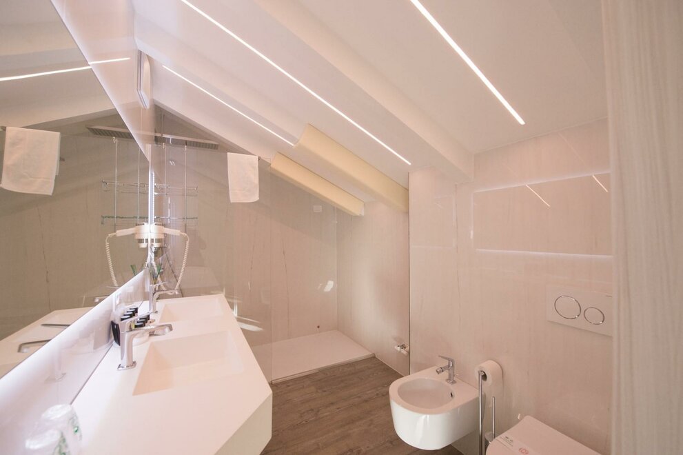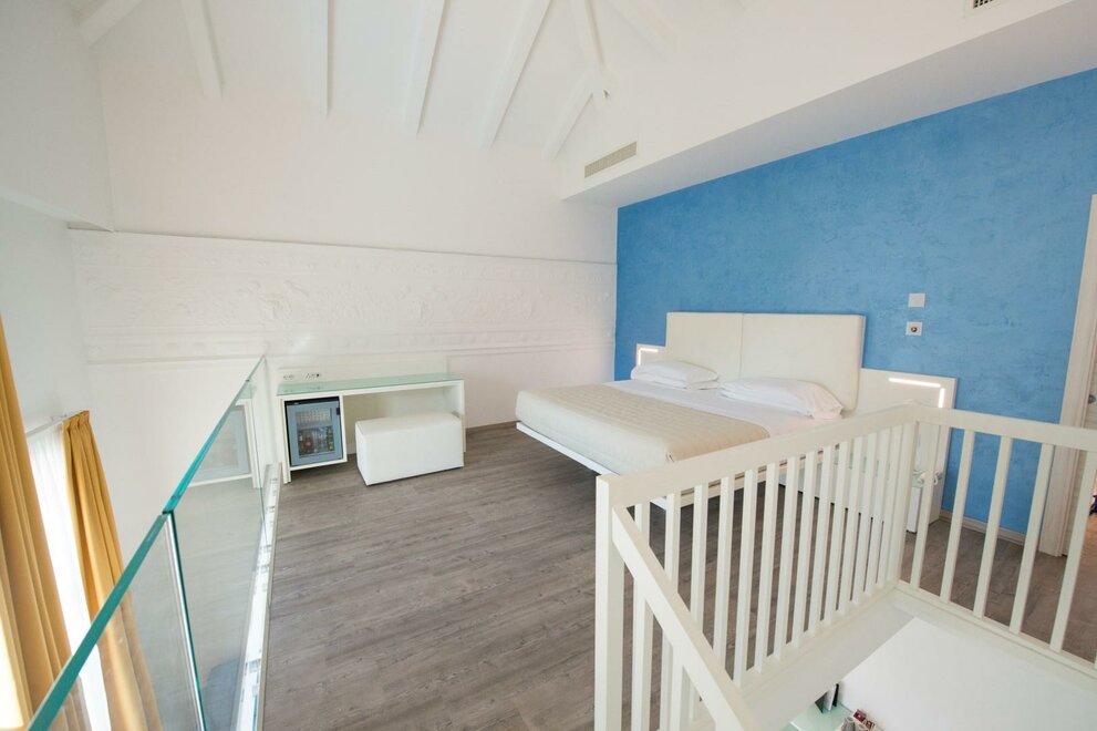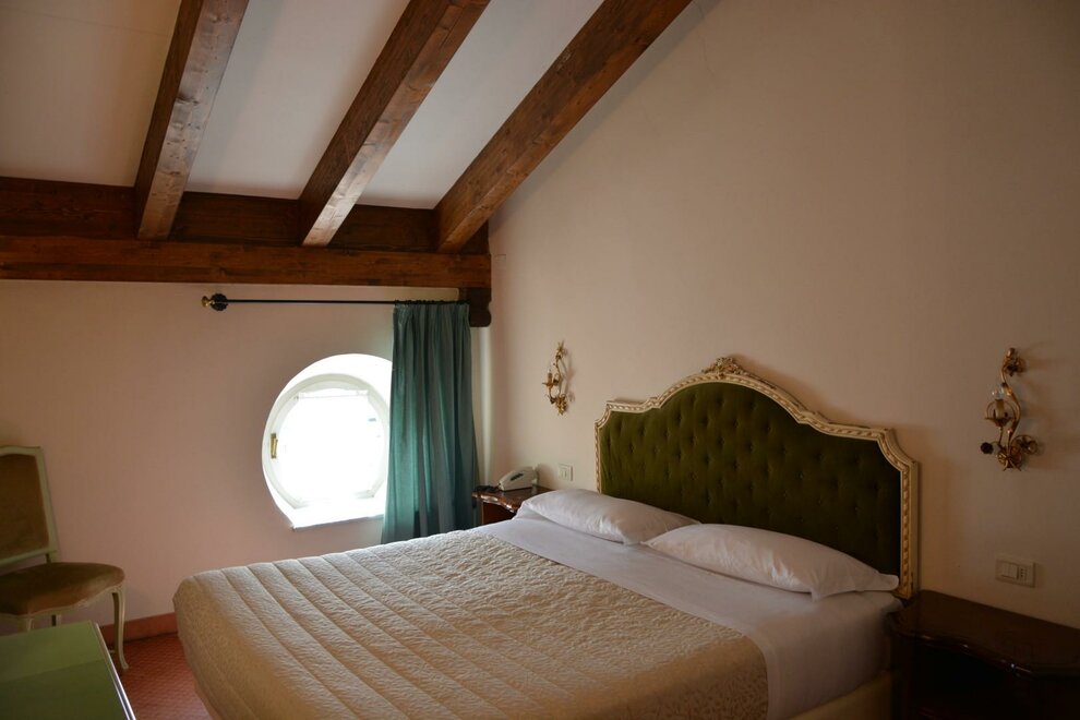 Al piano superiore mansardato (dotato di piccola finiestra posta al di sotto del tetto a spiovente) si trovano la stanza con letto matrimoniale, TV piatta, minibar ed il bagno dotato di doccia e doppi lavandini.