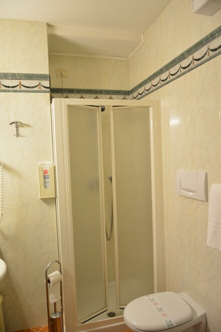 Camera doppia mansardata (piccola finestra sotto il tetto) con bagno fornito di doccia.