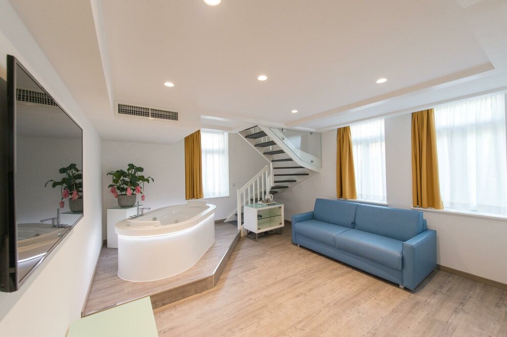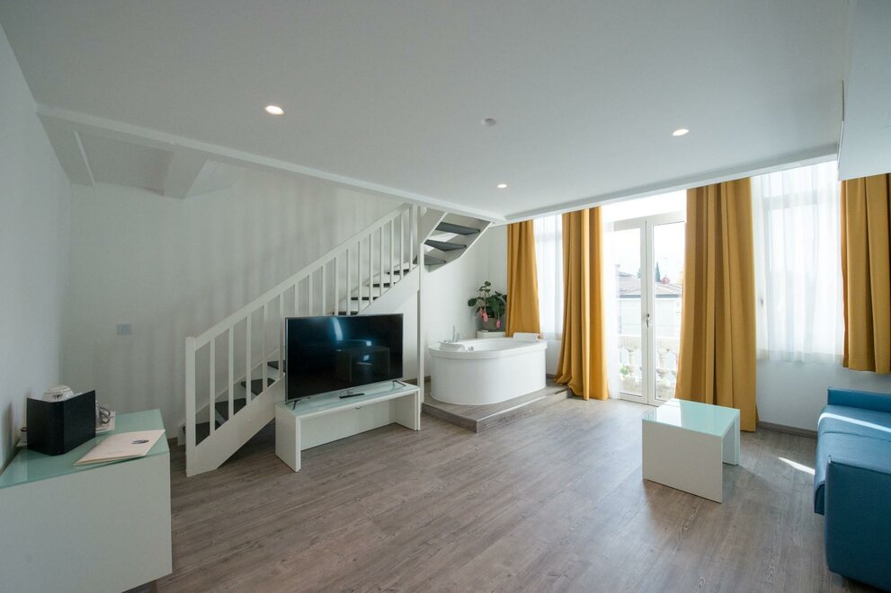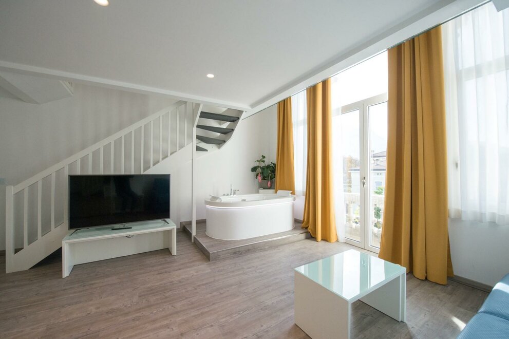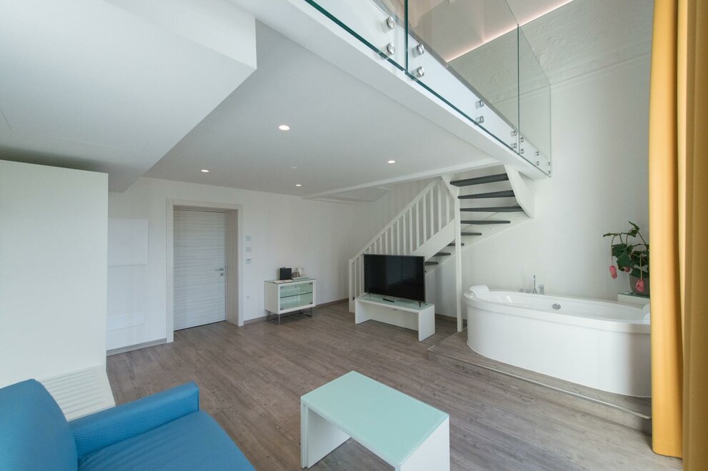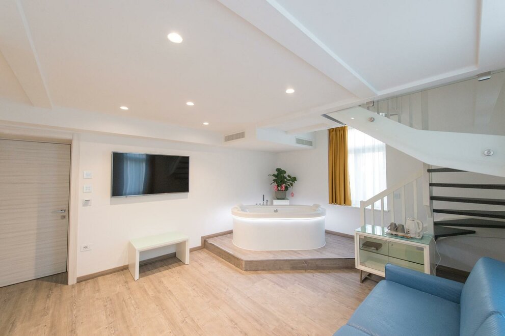 Camera doppia disposta su 2 livelli: al piano inferiore un piccolo soggiorno con divano letto,TV piatta e vasca idromassaggio Jacuzzi.