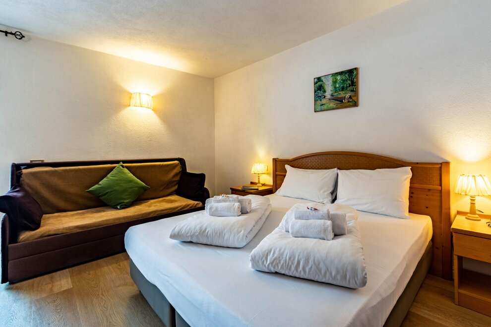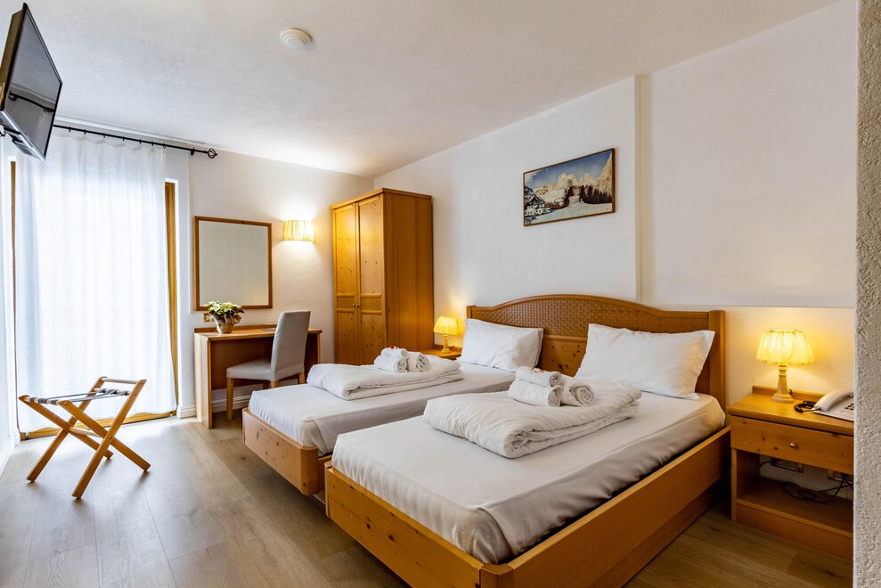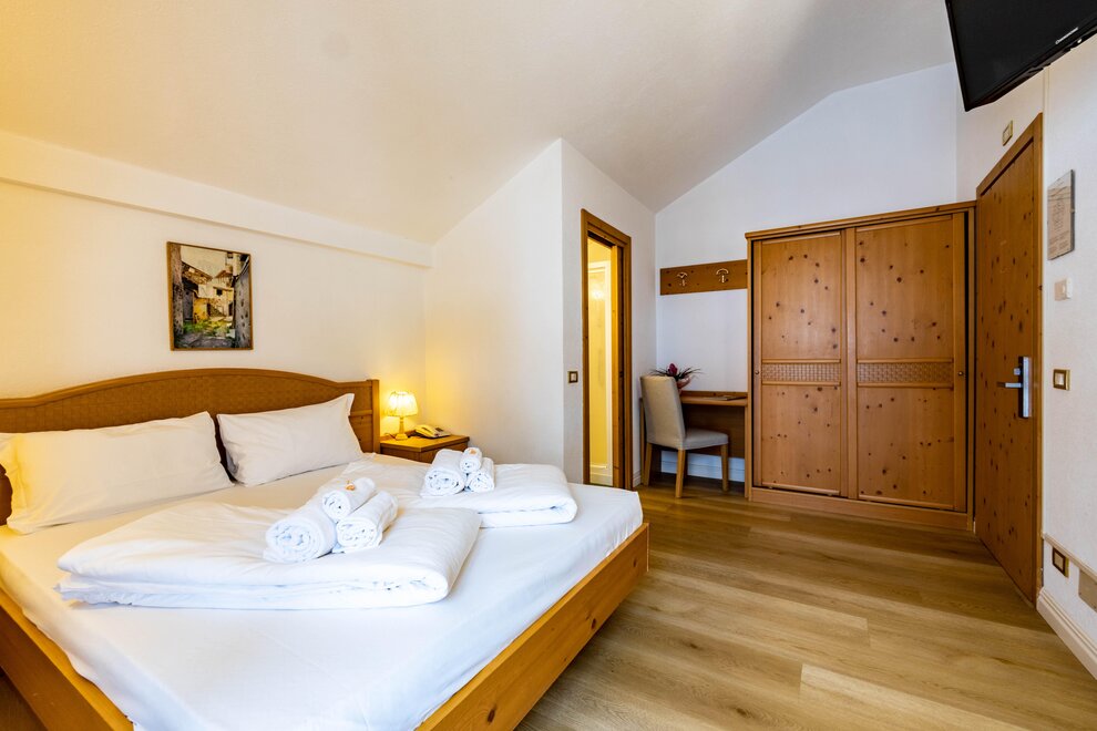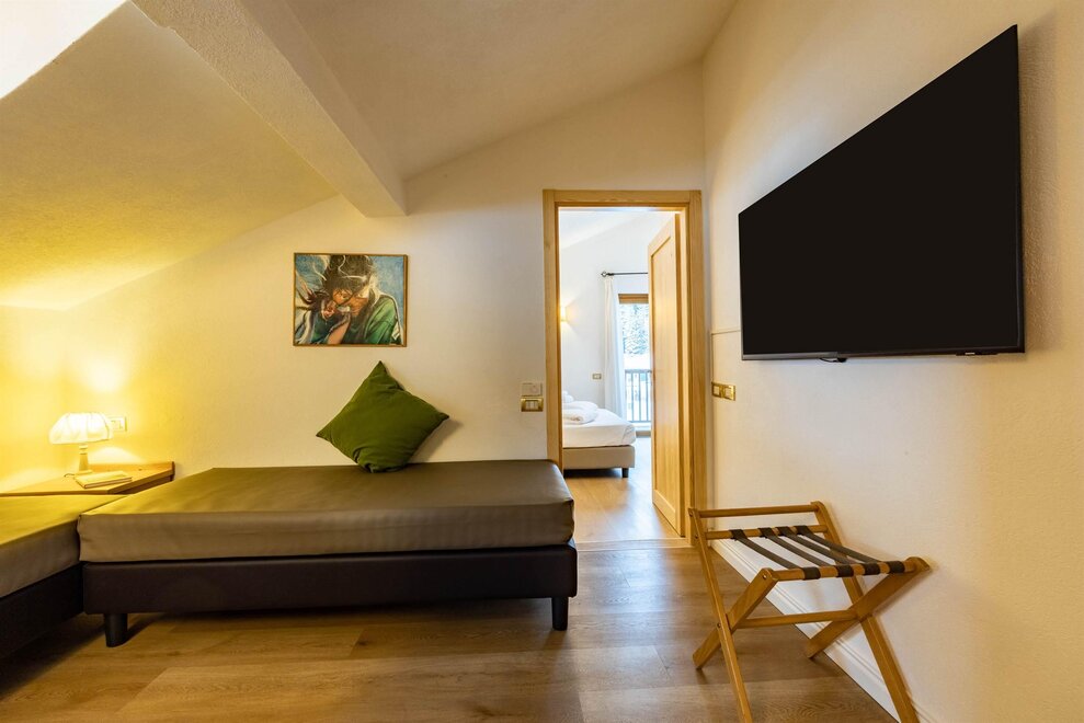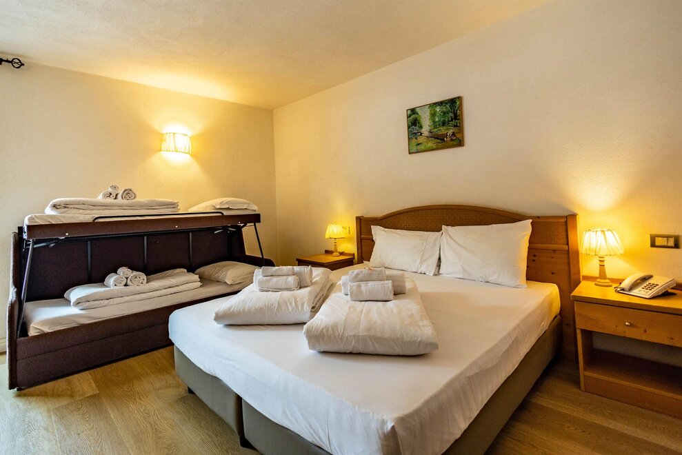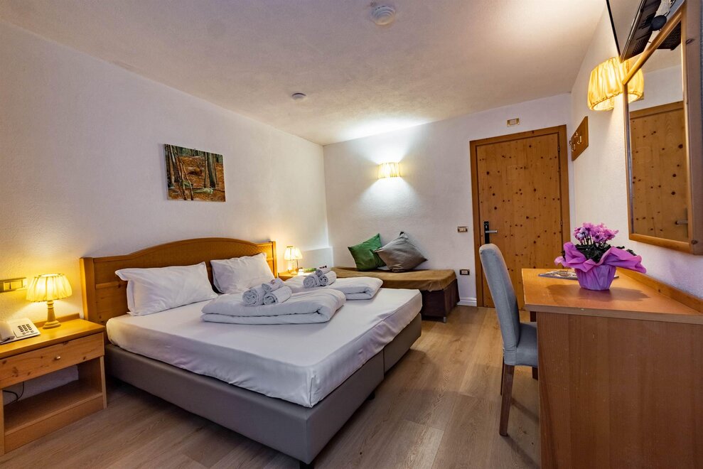 Stanza con letto matrimoniale, servizi, Tv, letto aggiunto.