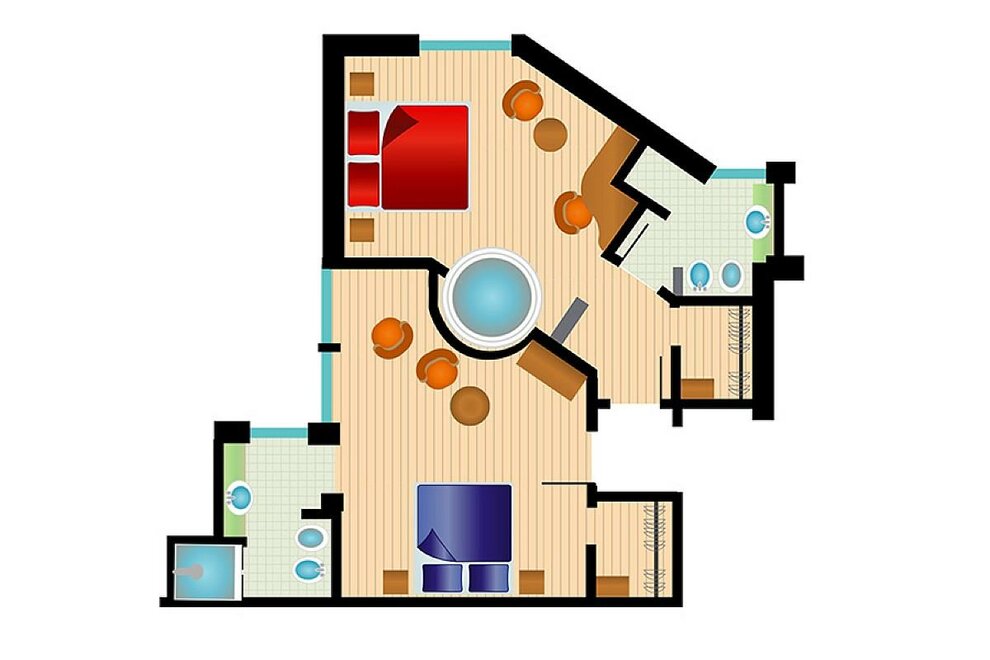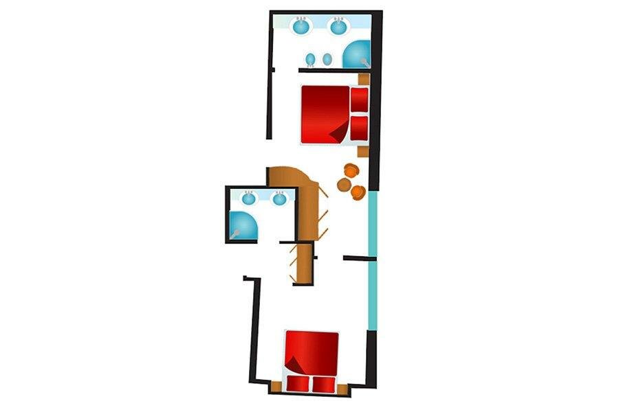 Family Suite VaelAmpia suite di circa 40 mq dall'arredamento in legno chiaro, la Family Suite Vael è composta due ambienti separati ma con ingresso unico: un salotto con tavolino con due sedie e panca, divano o due letti singoli, cabina armadio e bagno di 5 mq, mentre il secondo da una camera con letto matrimoniale, armadio e bagno da 5 mq.