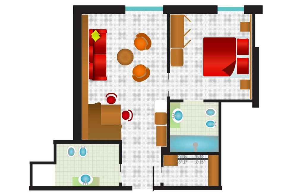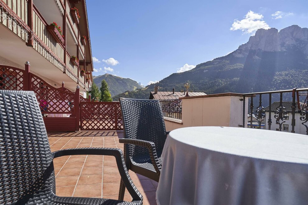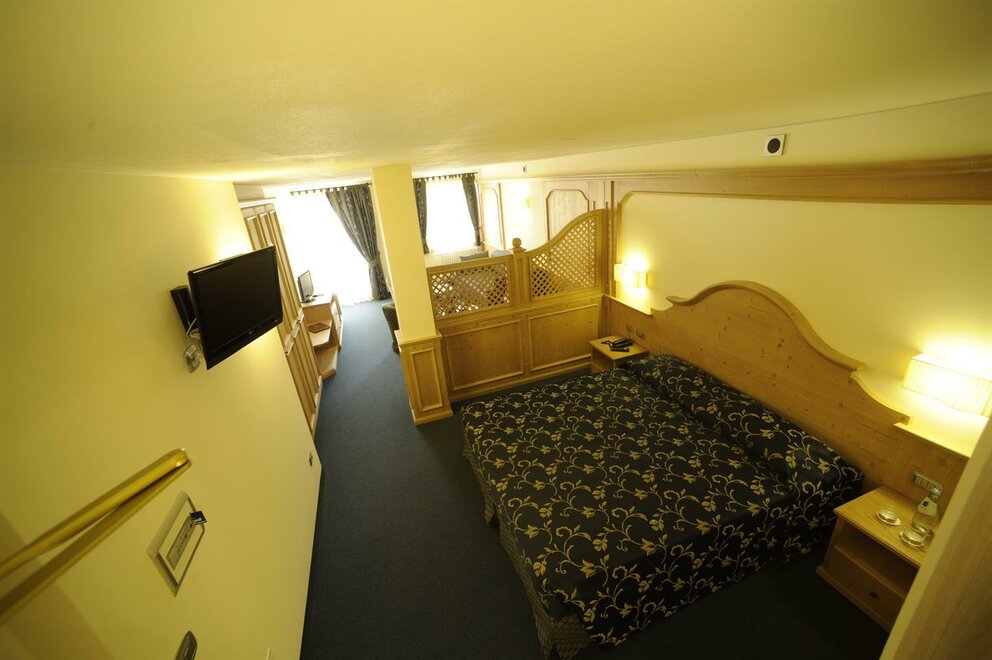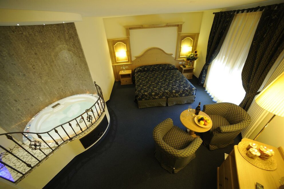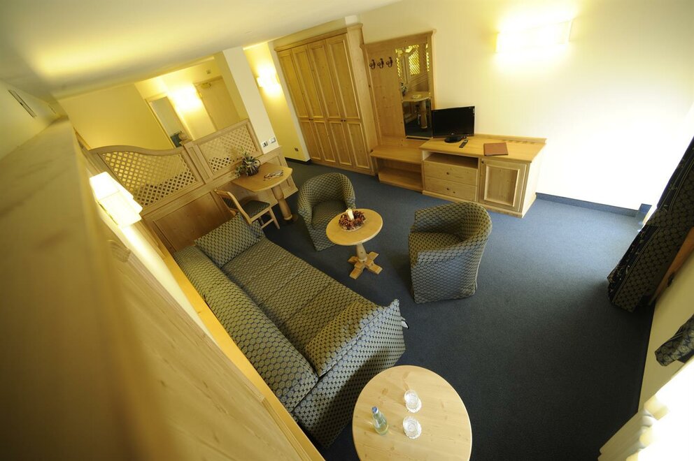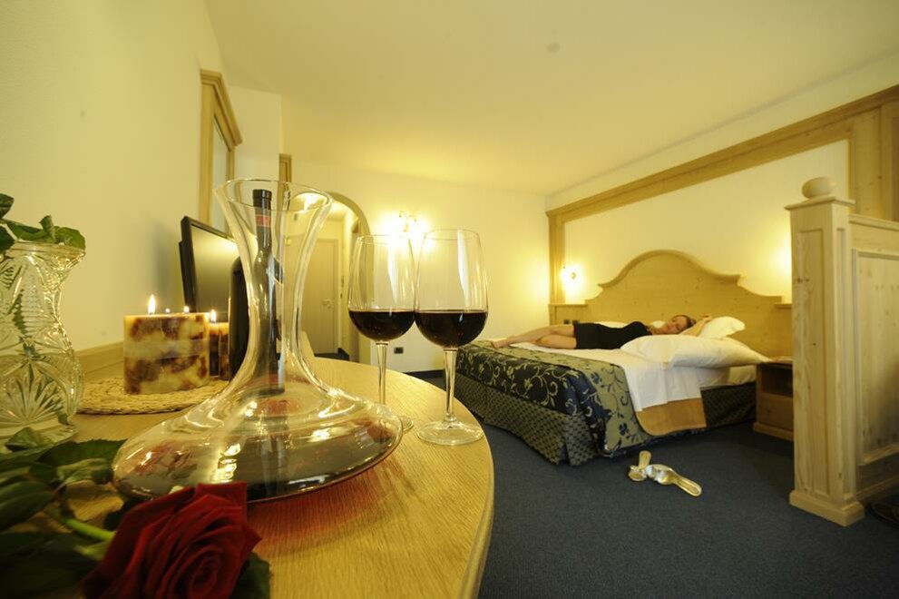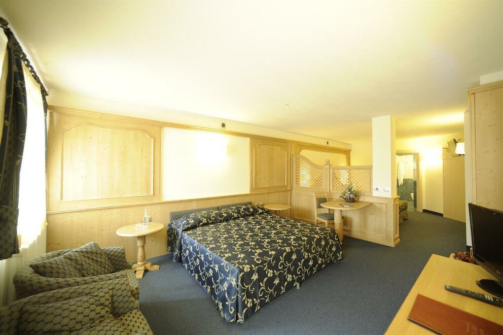 Junior Suite di 28 mq, con 1 letto matrimoniale ed un letto singolo, un tavolino e due poltroncine. Tv a schermo piatto, cassaforte e frigobar, telefono, phon in bagno. La stanza presenta il pavimento in moquette anallergica e un arredamento in legno di abete. Il balcone è rivolto verso est, con parziale vista panoramica. Il bagno è di circa 6 mq. Wi-fi gratuito.dotazioni camere/appartamenti
