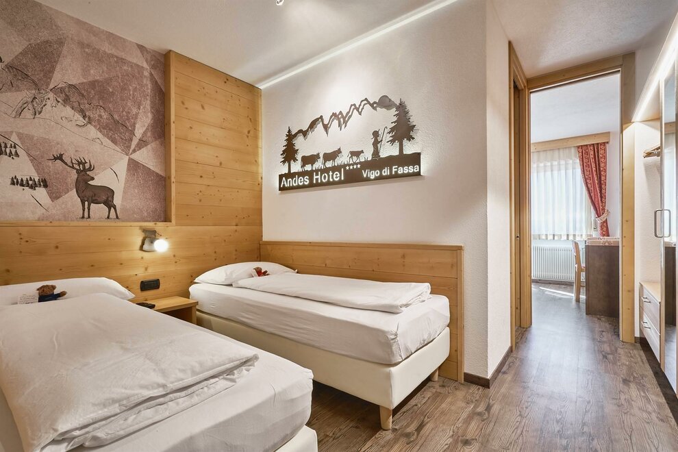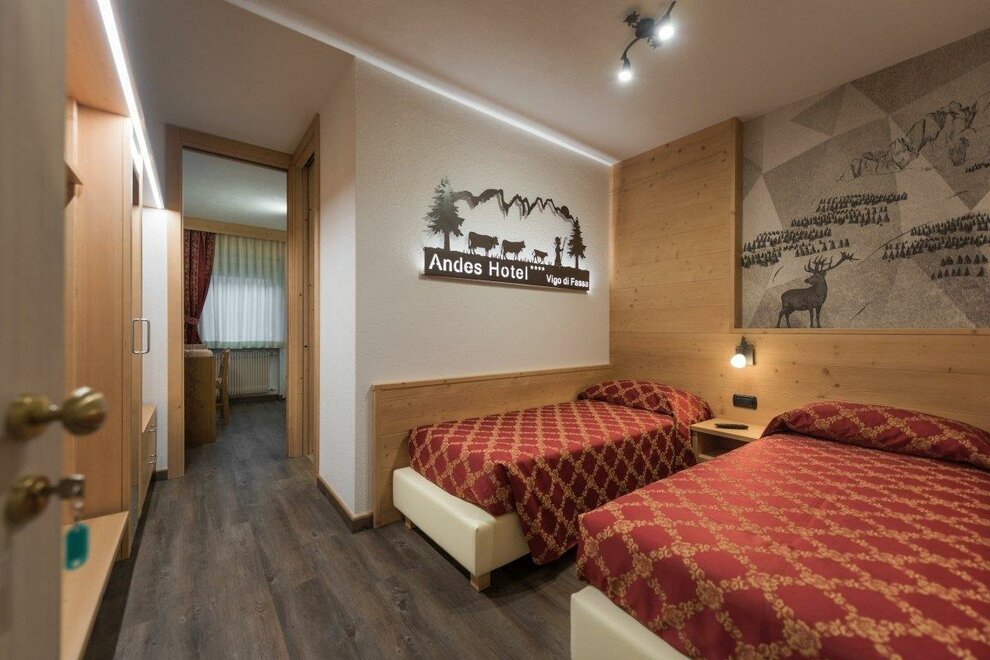 L'Hotel Andes, ubicato nel centro del paese, in zona tranquilla e soleggiata, a pochi metri dalla funivia del Catinaccio, offre un ambiente moderno, elegante e curato, ideale per indimenticabili vacanze estive ed invernali. Camere con servizi, balcone, telefono, TVsat, cassaforte, phon. Bar, sala con maxi schermo. Sala giochi per bambini, Video Game, ping pong, calcetto. Ascensore. Parcheggio riservato e garage. Centro salute ed estetica: sauna finlandese, bagno turco, thermarium, idromassaggio, solarium viso e corpo, palestra con spinning bike, estetista a disposizione per trattamenti personalizzati e massaggi. Trattamento familiare e servizio accurato. Cucina caratterizzata da scrupolosa genuinità. Buffet di verdure a pranzo e cena. Prima colazione a buffet. Settimanalmente vengono organizzate cena tipica e grigliata in baita. Escursioni guidate e Nordic Walking.