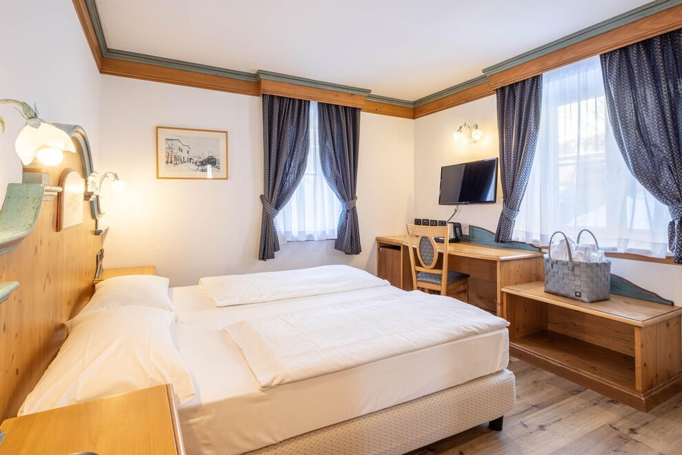 Le nostre camere Classic, da 20 mq. sono affacciate a Nord verso i boschi di Cavalese. L’arredamento è quello tipico montano con il pavimento effetto legno. Queste camere, senza balcone, sono la giusta combinazione tra conveninza e comfort. Ecco cosa troverete in ogni camera: