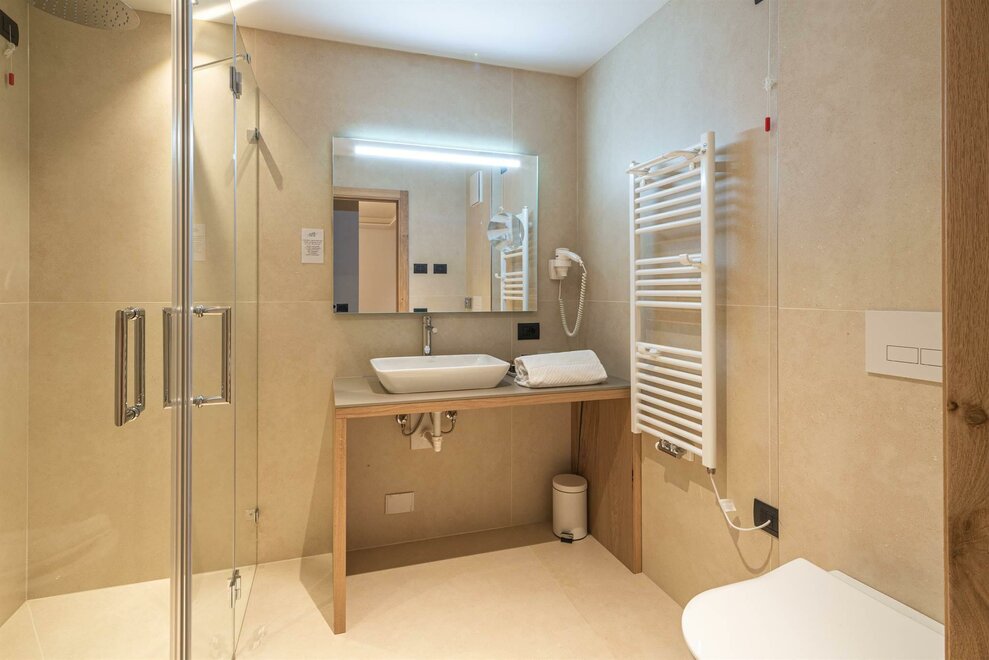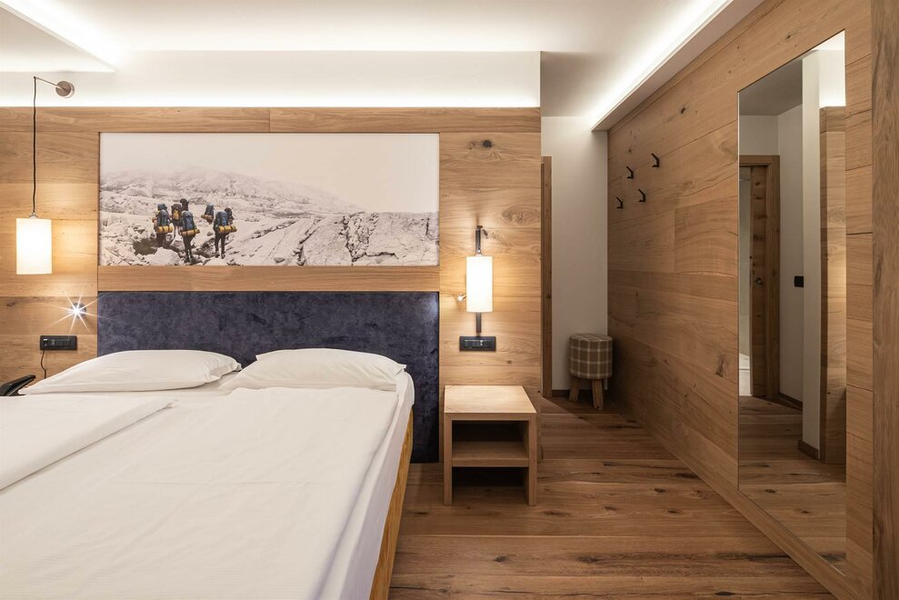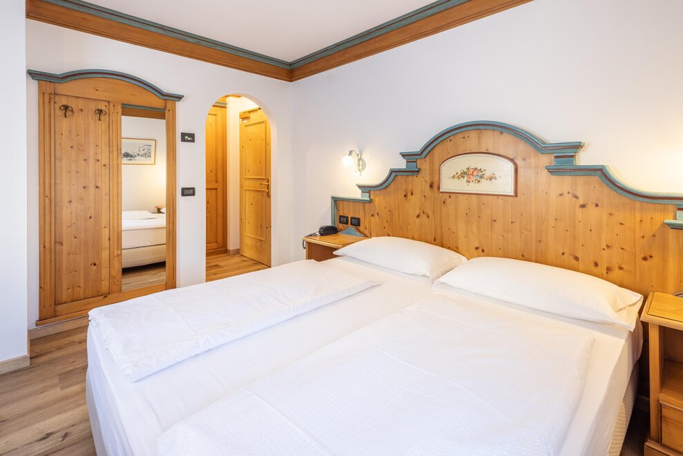 Le nostre camere Comfort doppie da 20 mq, si distinguono dalle Classic per la presenza del balcone privato, rivolto a Nord o a Sud, da cui ammirare la vista sulle montagne e sui boschi di Cavalese. L’arredamento è quello tipico montano con il pavimento effetto legno.