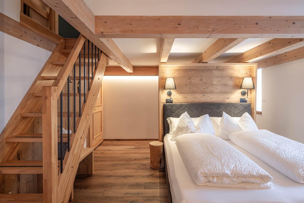 La nostra Junior suite, da 33 mq, è disposta su due livelli: letto matrimoniale a piano terra e soppalco con letto singolo e altro letto estraibile. La stanza può ospitare fino a 4 persone, dispone di balcone con vista a Sud ed è arredata nello stile tipico di montagna. Ecco cosa troverete nella vostra Junior Suite: