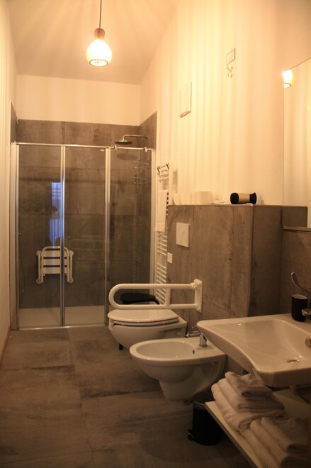 sedia per doccia, wc con maniglioni, lavabo più basso, doccia a filo pavimento, campanello di emergenza in bagno, non sono presenti scale o gradini per entrare, wc con seduta rialzata