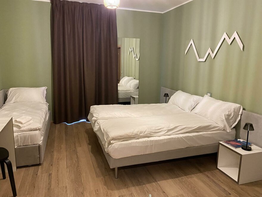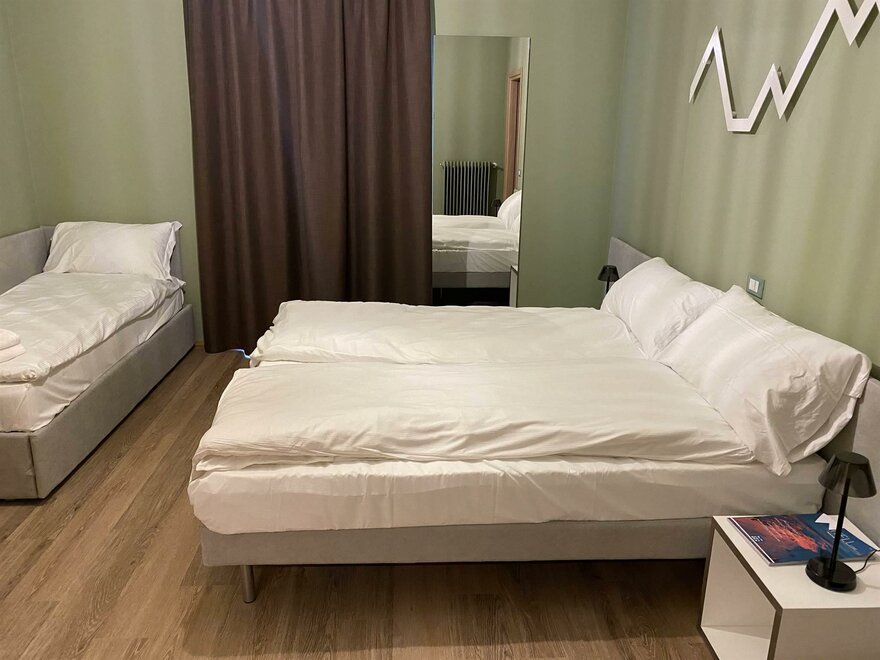 Camera tripla composta da un letto matrimoniale e un letto singolo oppure tre letti singoli,dotata di bagno privato con doccia, cassa forte frigo bar e smart tv 32'' con schermo piatto
