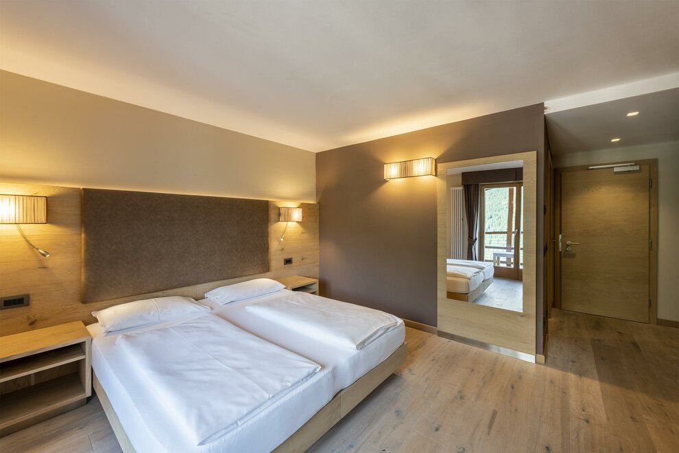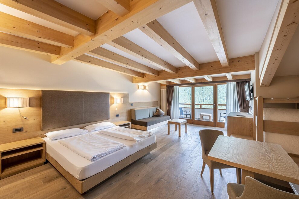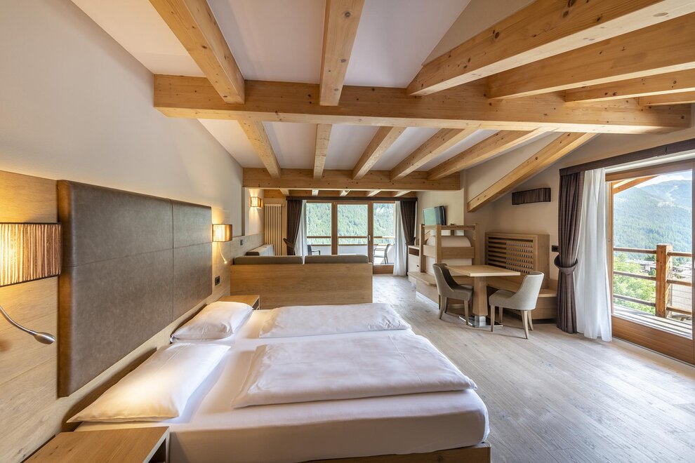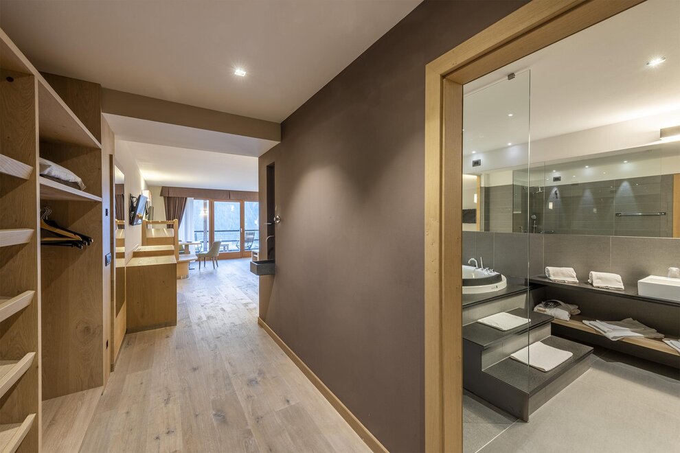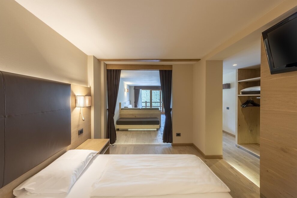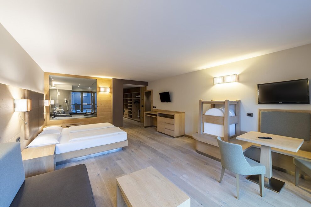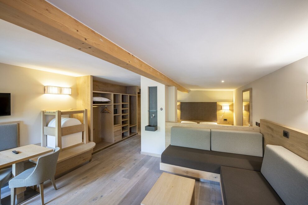 Lato sud, vista valle e sulle Dolomiti. Suite con parete scorrevole, separabile in 2 camere completamente autonome, ognuna con il suo servizio. 59 mq più ampio balcone con poltroncine in legno, 2 TV schermo piatto, computer connesso ad internet, wi-fi gratuito, 2 servizi completi ciascuno con piano in pietra e lavabo-bidet-WC. Cabina doccia con parete in cristallo, oppure doccia con box in vetro, oppure vasca da bagno. Letto matrimoniale e zona separata da parete scorrevole con 2 letti singoli, zona soggiorno con tavolo e sedie, tavolino, stufa tipica ladina con panca il legno, parete armadio di 2,5 mt. Possibile occupazione da 2 persone fino a 4 persone(senza letti aggiunti).
