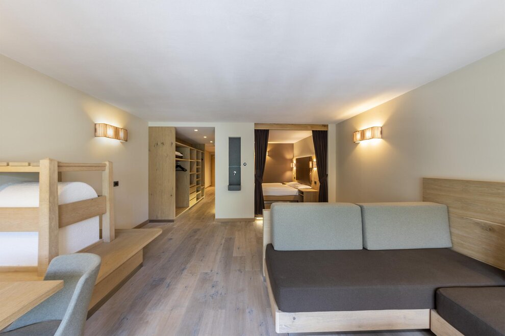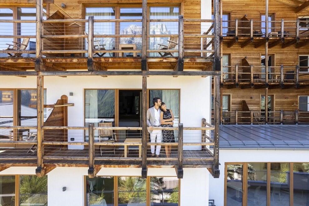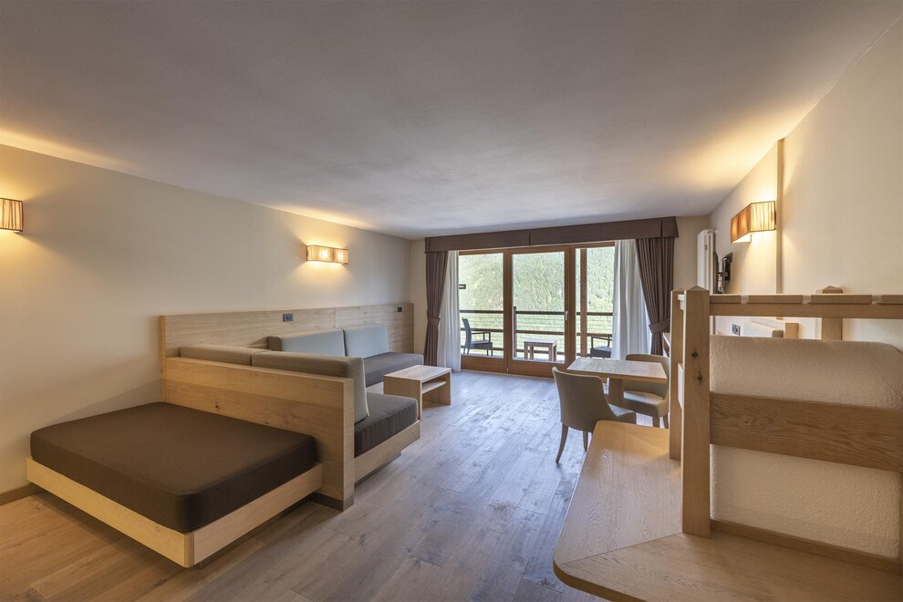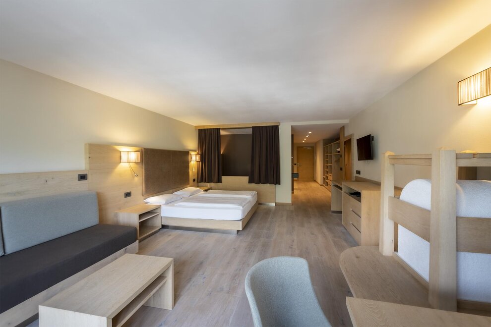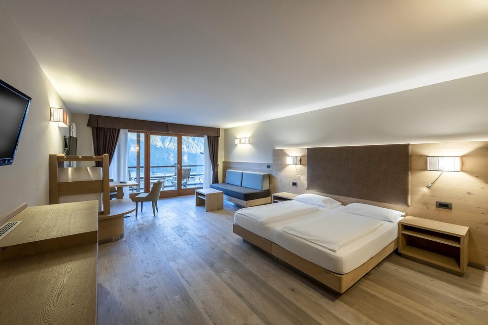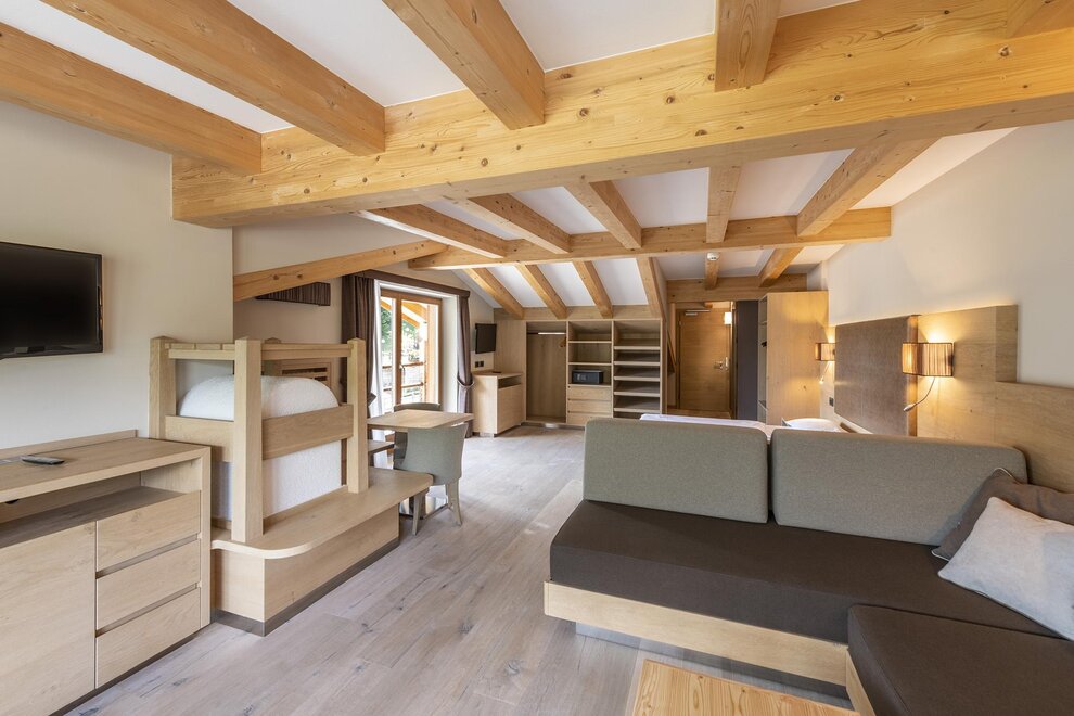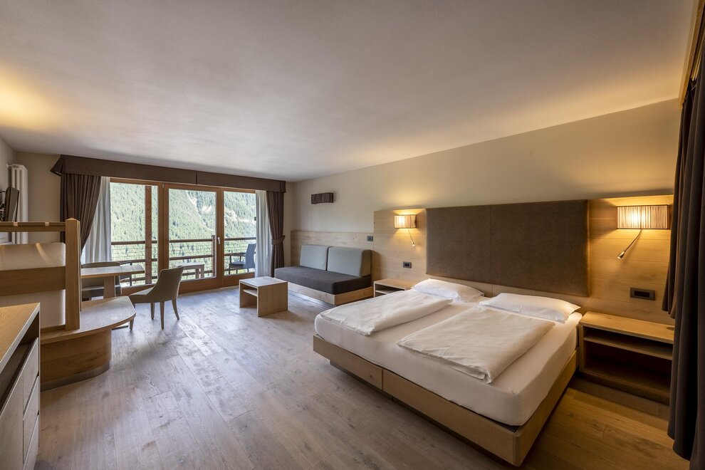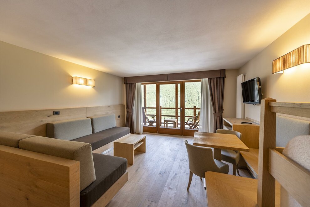Lato sud, vista valle e sulle Dolomiti. Suite con parete scorrevole, separabile in 2 camere completamente autonome, ognuna con il suo servizio. 59 mq più ampio balcone con poltroncine in legno, 2 TV schermo piatto, computer connesso ad internet, wi-fi gratuito, 2 servizi completi ciascuno con piano in pietra e lavabo-bidet-WC. Cabina doccia con parete in cristallo, oppure doccia con box in vetro, oppure vasca da bagno. Letto matrimoniale e zona separata da parete scorrevole con 2 letti singoli, zona soggiorno con tavolo e sedie, tavolino, stufa tipica ladina con panca il legno, parete armadio di 2,5 mt. Possibile occupazione da 2 persone fino a 4 persone(senza letti aggiunti).