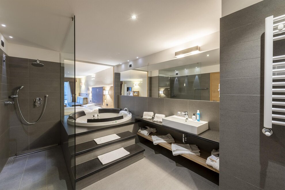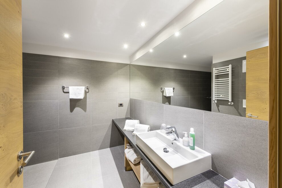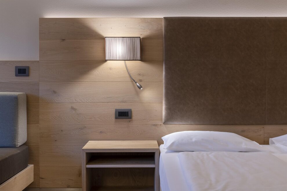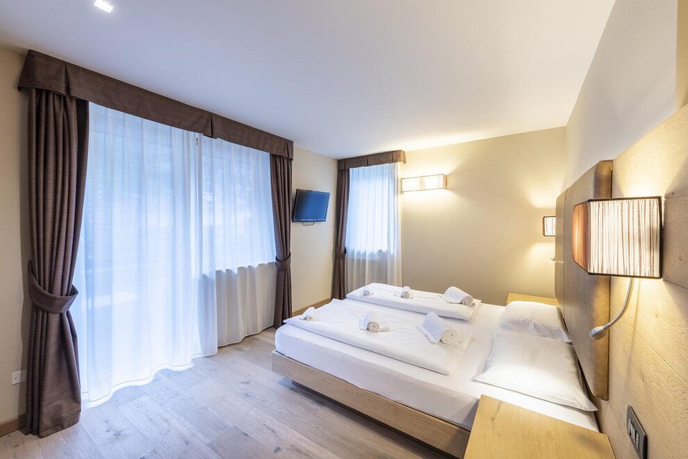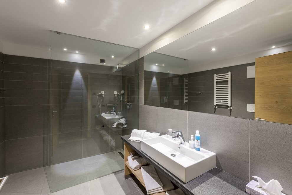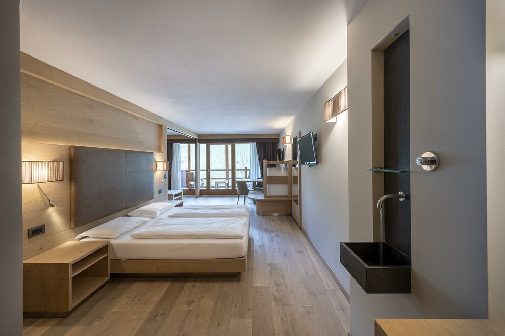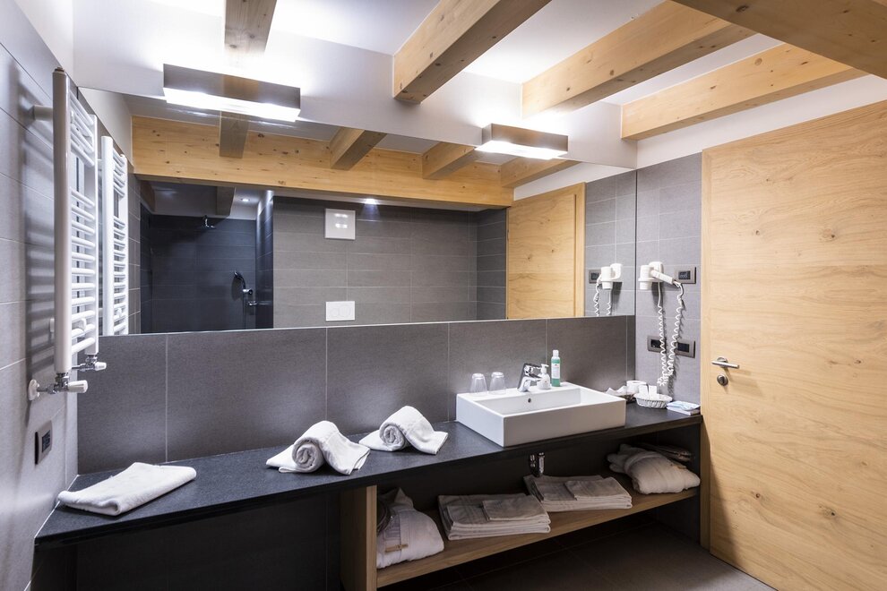 Lato sud, vista valle e sulle Dolomiti. Suite con parete scorrevole, separabile in 2 camere completamente autonome, ognuna con il suo servizio. 59 mq più ampio balcone con poltroncine in legno, 2 TV schermo piatto, computer connesso ad internet, wi-fi gratuito, 2 servizi completi ciascuno con piano in pietra e lavabo-bidet-WC. Cabina doccia con parete in cristallo, oppure doccia con box in vetro, oppure vasca da bagno. Letto matrimoniale e zona separata da parete scorrevole con 2 letti singoli, zona soggiorno con tavolo e sedie, tavolino, stufa tipica ladina con panca il legno, parete armadio di 2,5 mt. Possibile occupazione da 2 persone fino a 4 persone(senza letti aggiunti).
