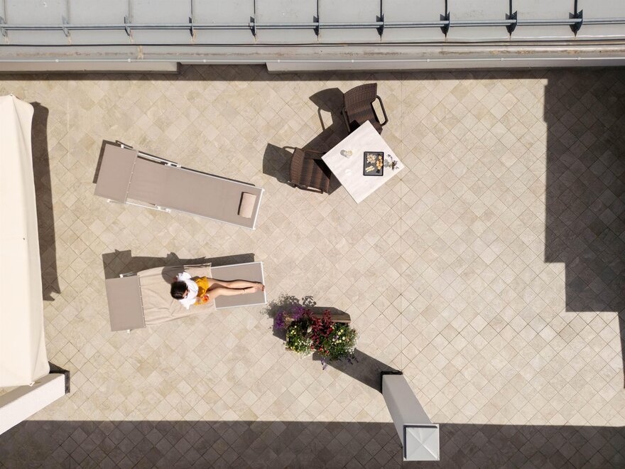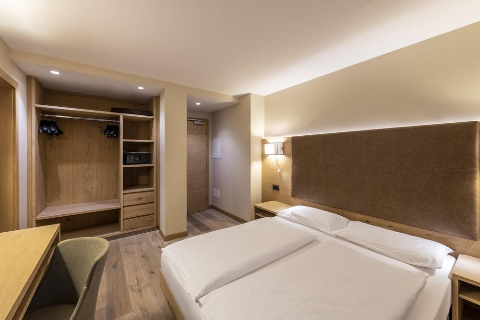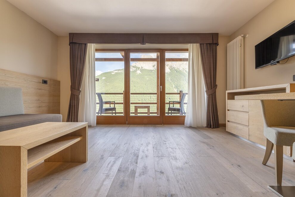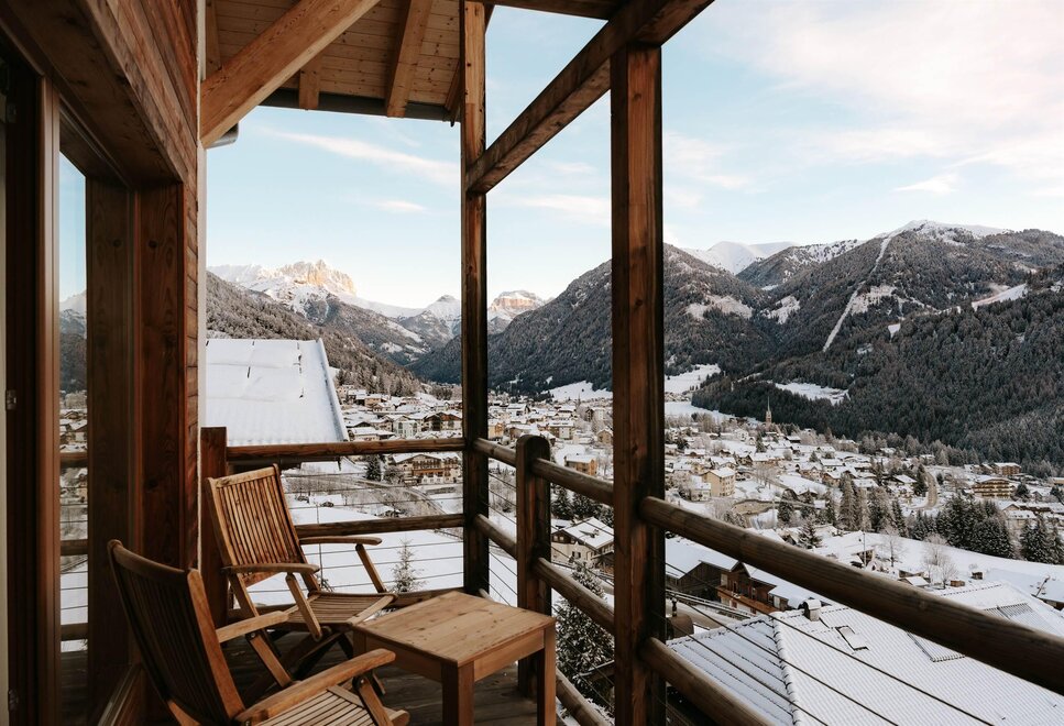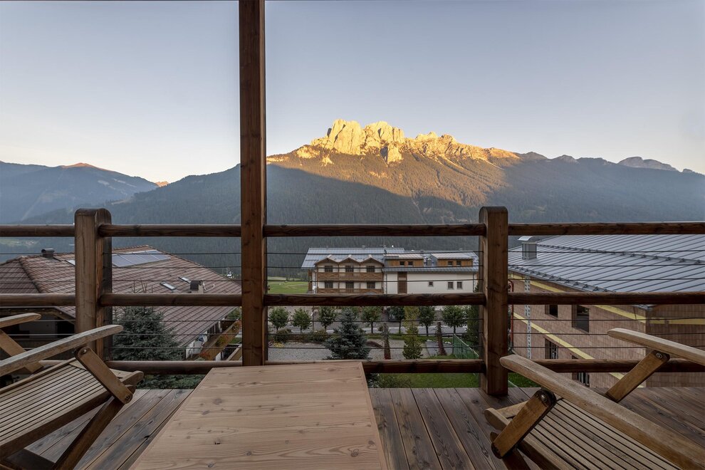 Lato sud, vista valle e sulle Dolomiti, 58 mq più ampio balcone con poltroncine in legno, 2 TV schermo piatto, wi-fi gratuito, doppio servizio: uno con lavabo-bidet-wc, il secondo con piano in pietra e lavabo-bidet-WC, ampia cabina doccia. Letto matrimoniale, zona soggiorno con 2 divani, tavolo con sedie, tavolino, stufa tipica ladina con panca il legno, parete armadio di 2,5 mt. Possibile occupazione da 2 persone fino a 3 persone(senza letti aggiunti).