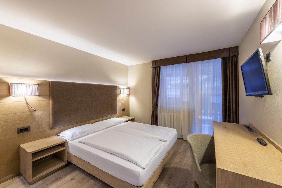 Lato sud, vista aperta sulla valle e sulle montagne di fronte, 28 mq più 4,5 mq di balcone, tv schermo piatto, computer con internet, wi-fi gratuito, servizio con ripiano in pietra-lavabo-bidet-WC, cabina doccia con parete in cristallo, letto matrimoniale/doppio, possibile occupazione con due persone, parete-armadio di 2,5 mt.