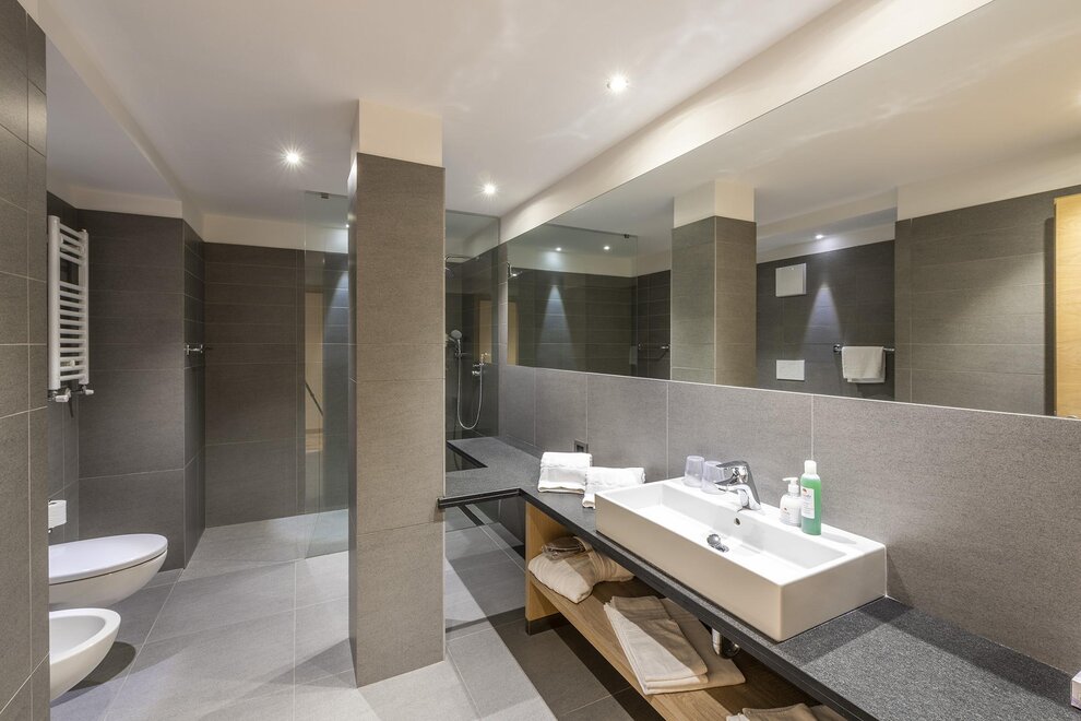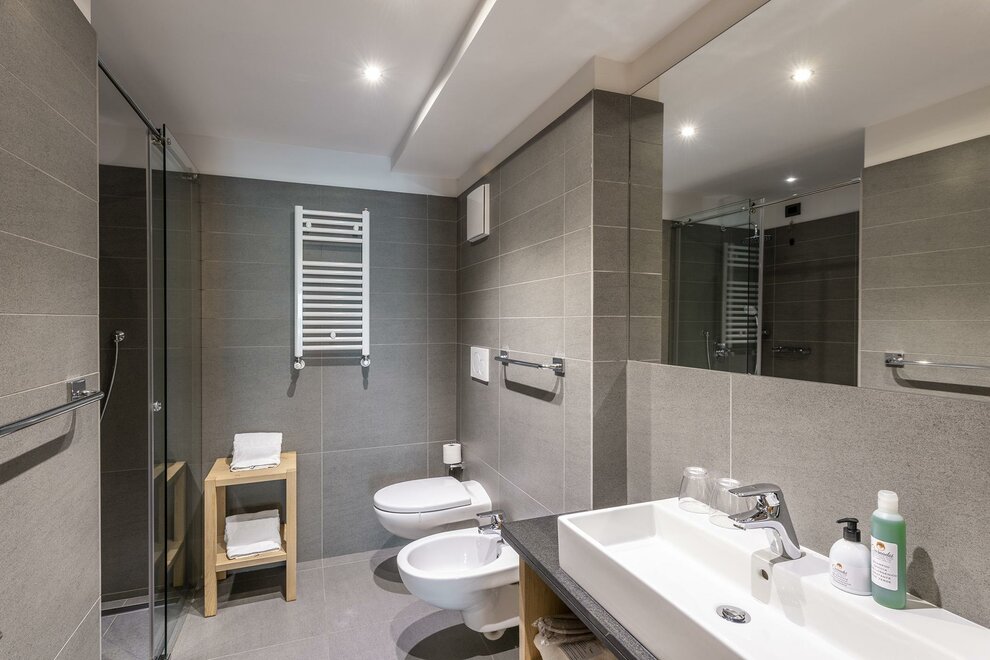 - Bagno con tavolo lavabo, bidet, WC, cabina doccia