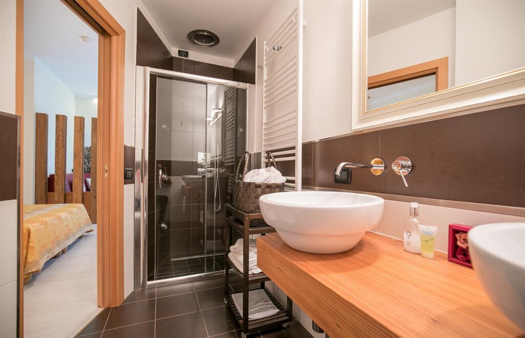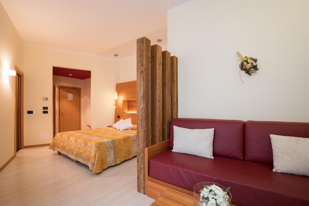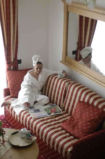 Stanza di 24 mq, non fumatori, arredata in legno, dotata di servizi privati con doccia, asciugacapelli, servizio cortesia e accappatoio, angolo lettura e soggiorno con divano, tv lcd, telefono, wifi, cassetta di sicurezza e due balconi vista giardino e montagne con sedie.