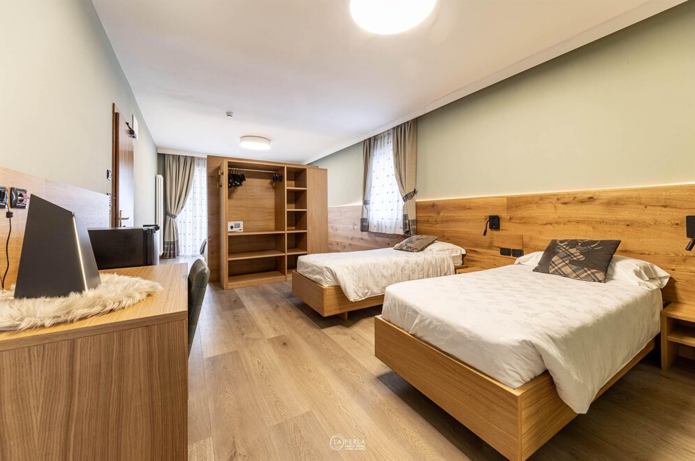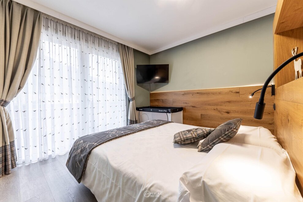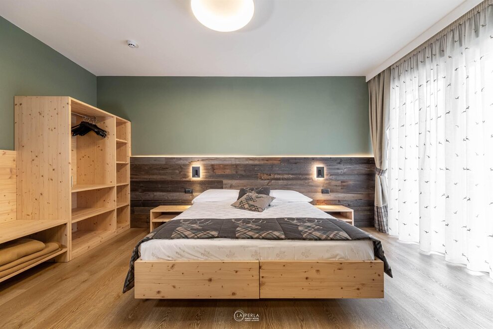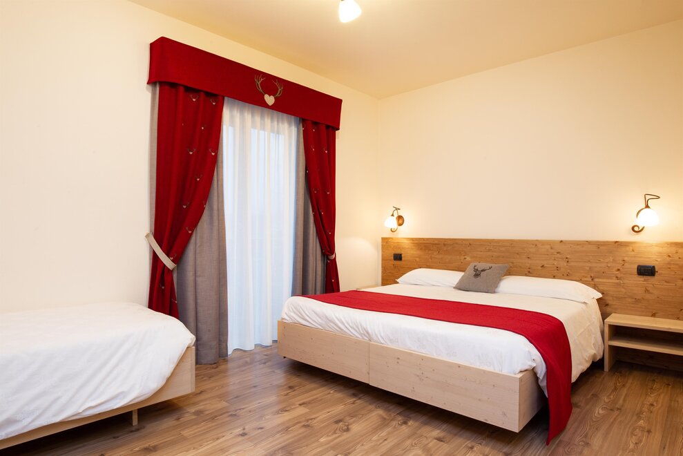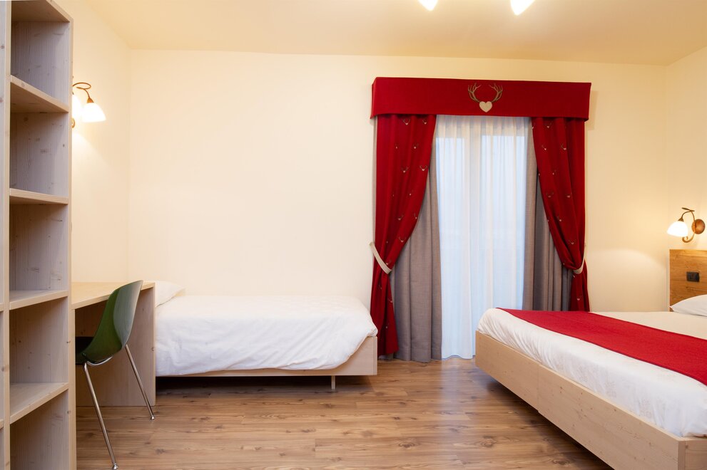 Stanza adatta ad ospitare tre persone (adulti o in famiglia con bambino), in letto matrimoniale con aggiunta di un letto (o un lettino o culla) o in tre letti separati. Ampia e luminosa, finemente caratterizzata da un arredamento recentemente rinnovato in stile tirolese.