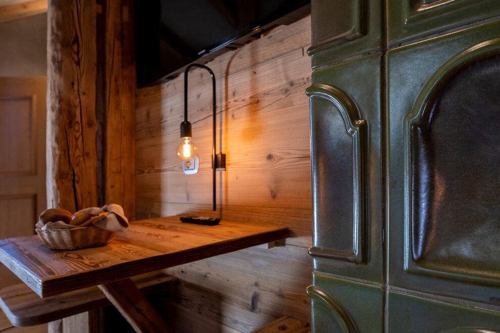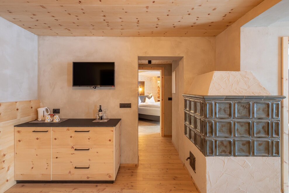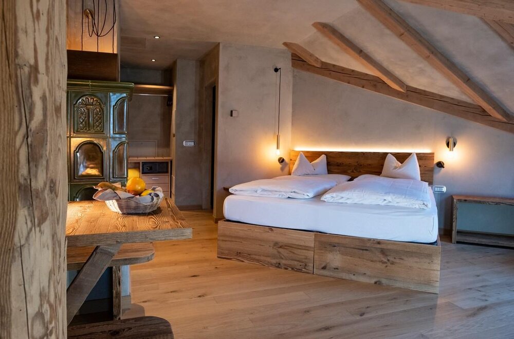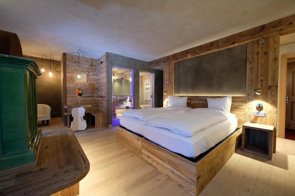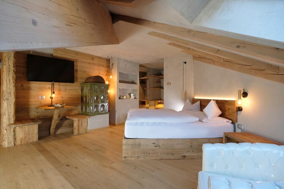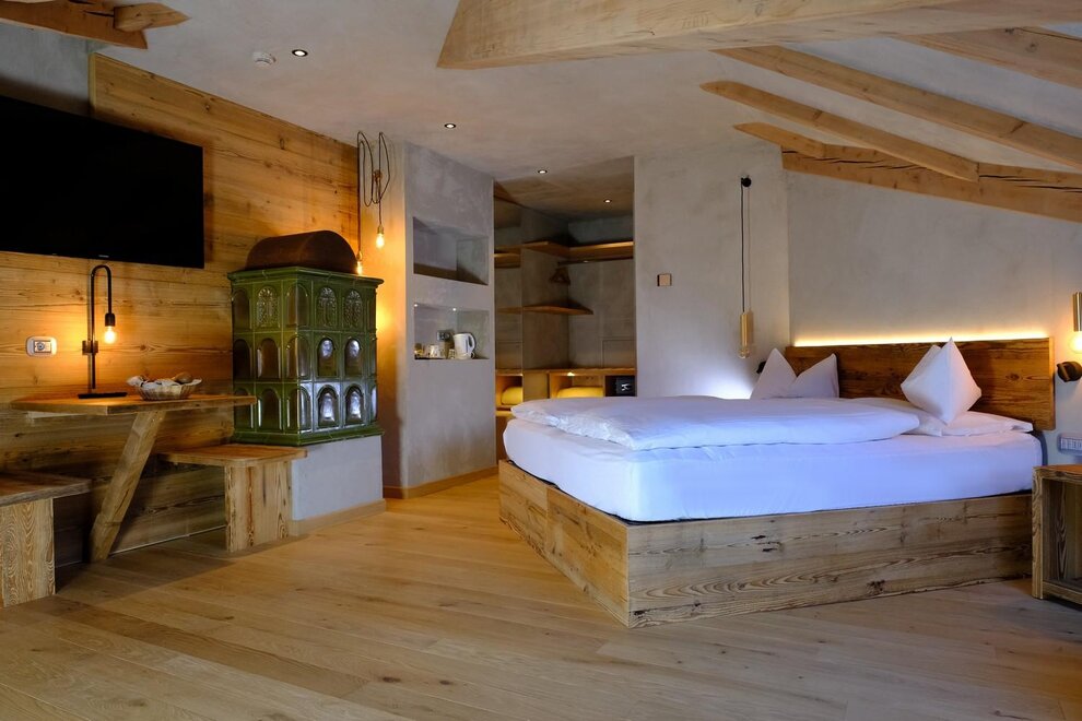 Junior Suite di grande fascino, con pavimento e mobili in legno anticato e una stufa ad ole originale.