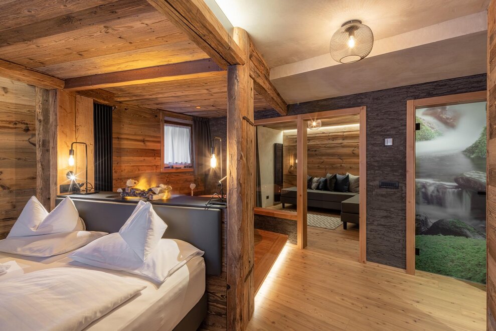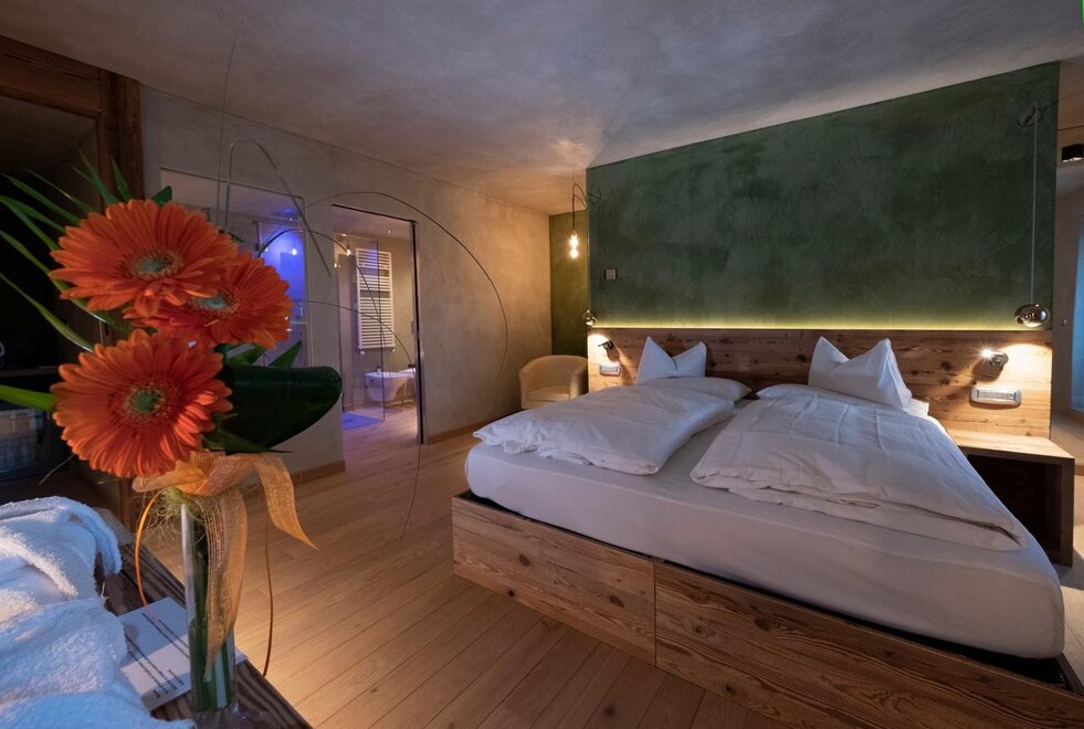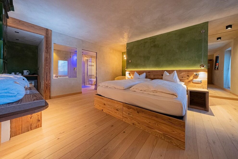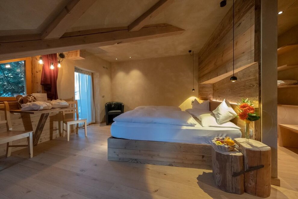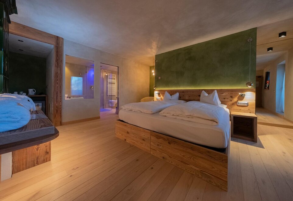 Suite di grande fascino di 50 mq e con balcone dove potrai godere una vista meravigliosa sulle Dolomiti e sulla Catena del Lagorai sorseggiando un calice di vino
