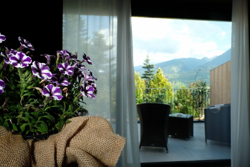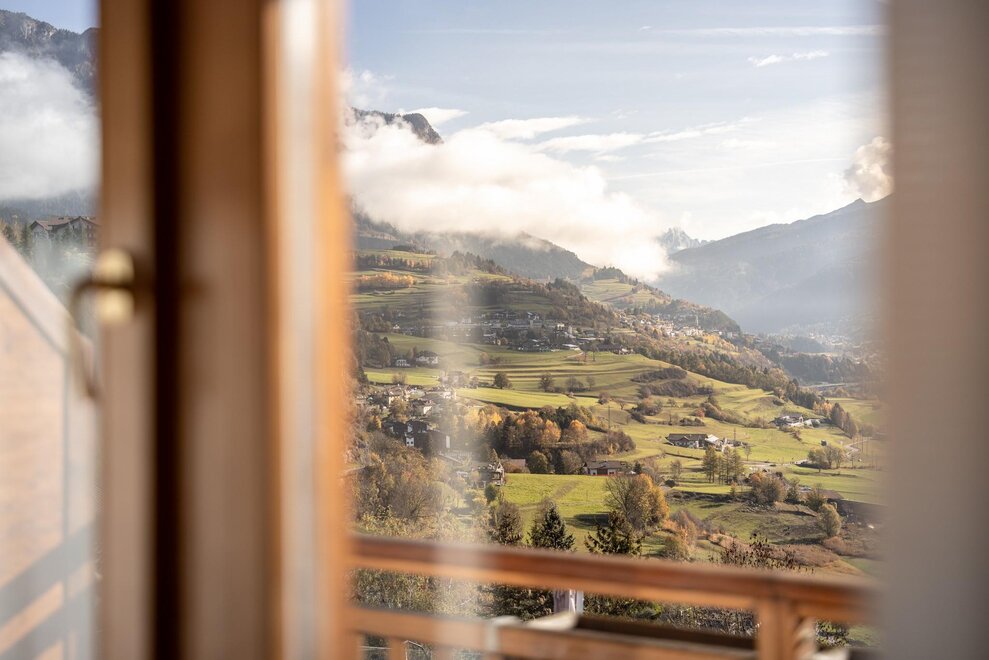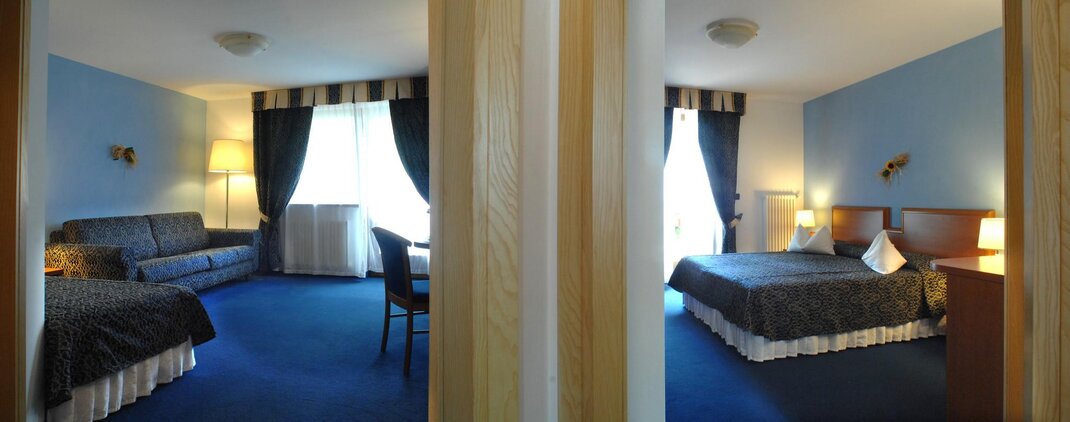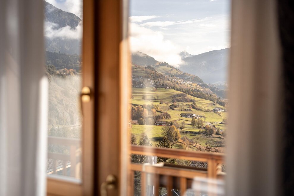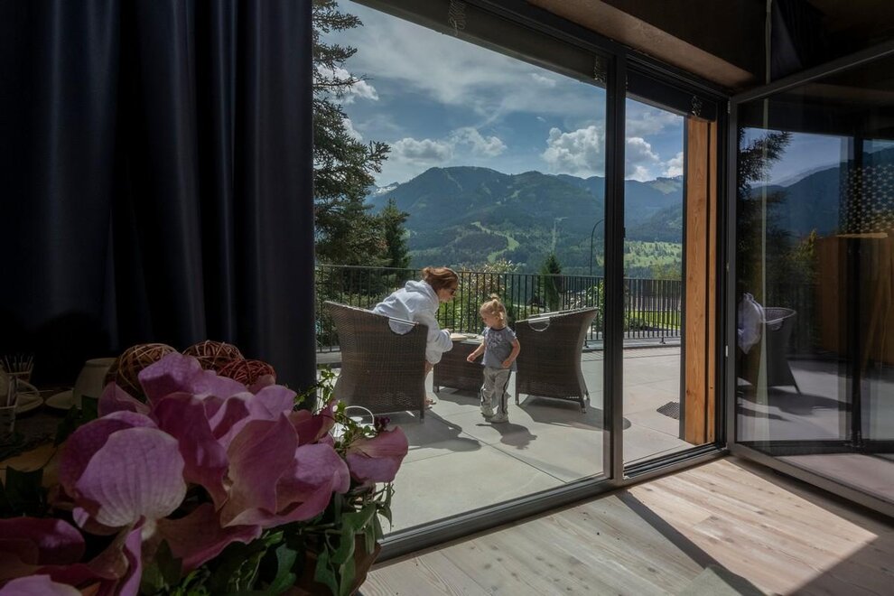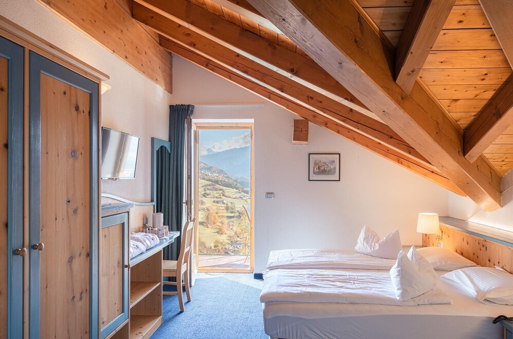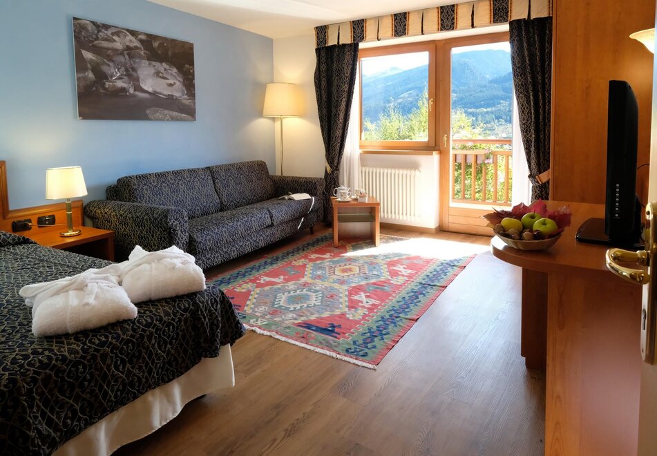 Junior Suite di grande fascino di 40 mq con balcone dove potrai godere una vista meravigliosa sulle Dolomiti e sulla Catena del Lagorai sorseggiando un calice di vino