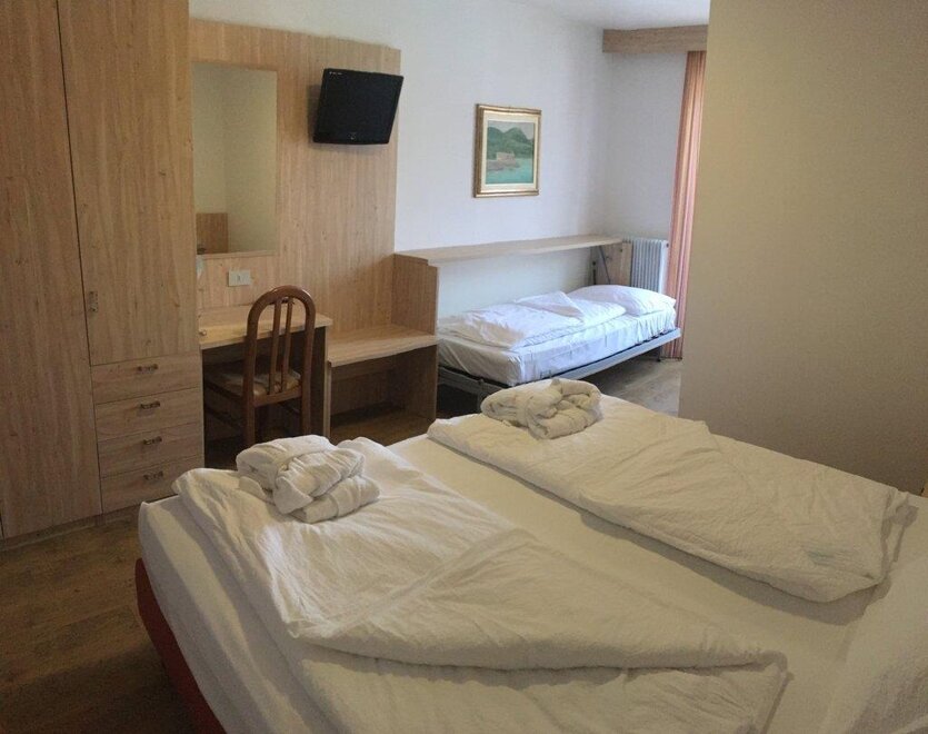 Camera con 3 letti separati o letto matrimoniale + terzo letto, di circa 20 mq, angolo scrittoio, bagno con doccia, lavandino con ripiano e specchiera, phon e toilette, Televisione a cavo, Telefono, Cassaforte. Wifi Gratuito disponibile nella hall dell'hotel.