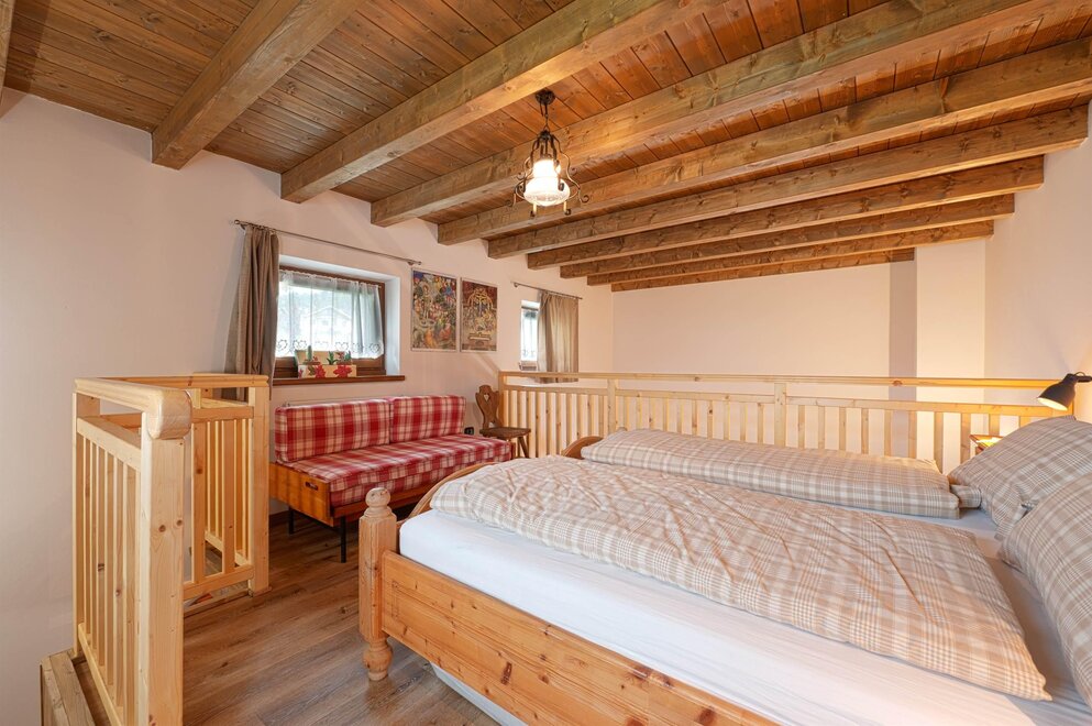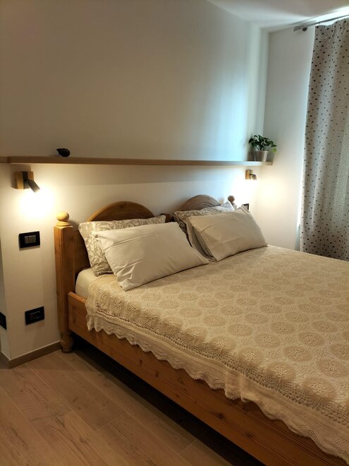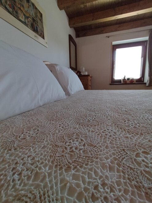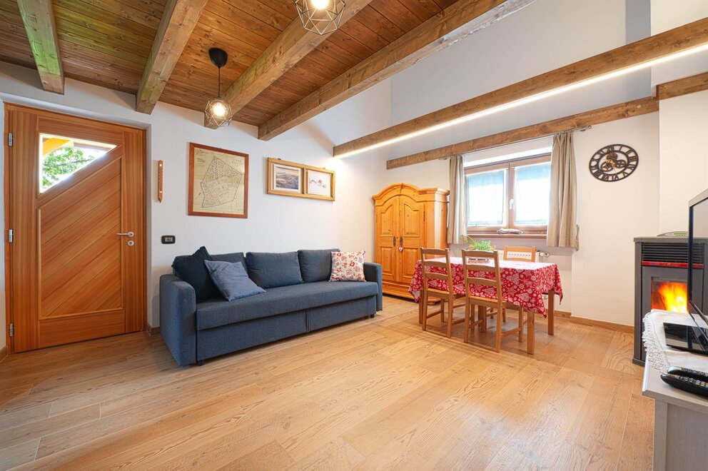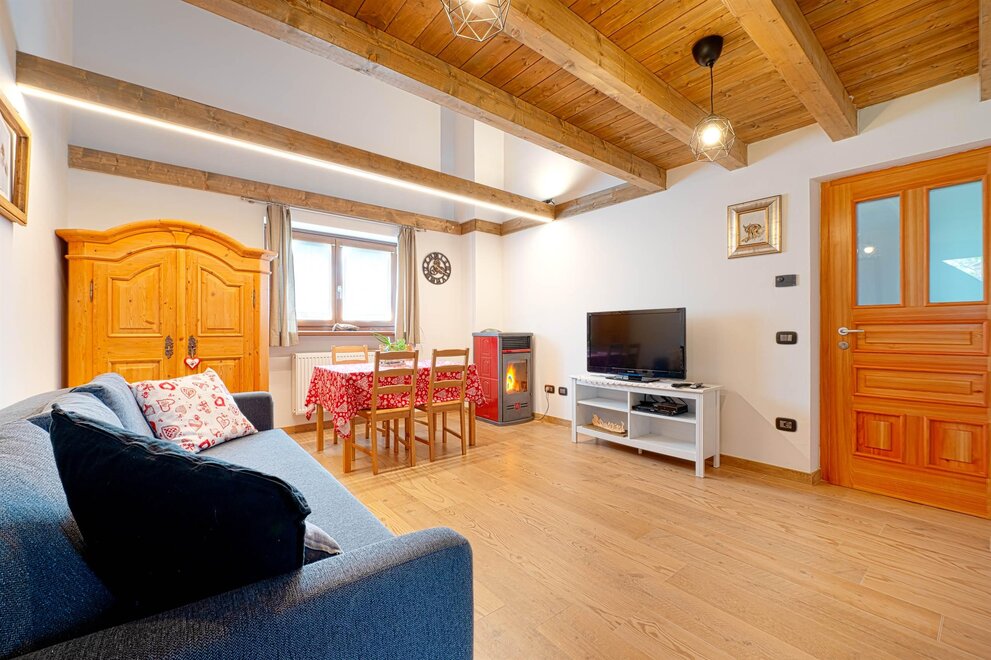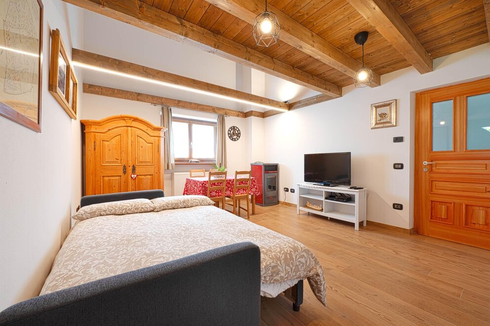 La camera Rustica è composta di 4 posti letto in un piccolo appartamentino, con zona giorno attrezzata con divano letto, tv, tavolo con sedie, stufa a pellet di rinforzo per inverni freddissimi, bagno privato finestrato, scala in legno che porta al soppalco con letto matrimoniale e possibilità di lettino aggiuntivo.
