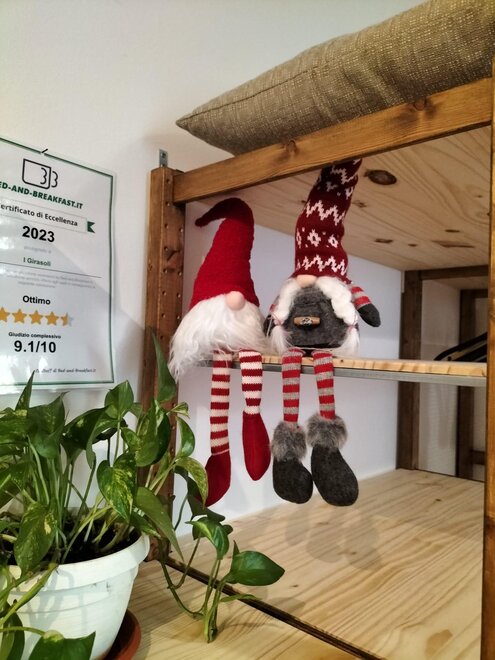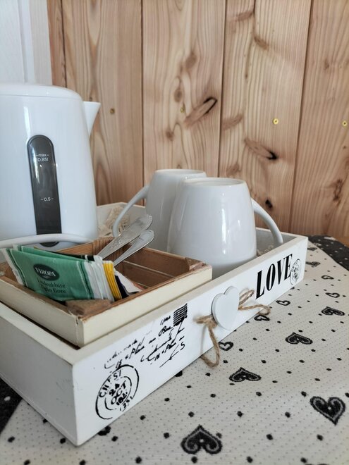 La camera Cuori è composta di 4 posti letto in appartamentino posto al piano terra. Stanza con letto matrimoniale, tv, soggiorno con divano letto, tavolo e sedie, bagno privato. Completano WI-FI, asciugacapelli, bollitore per tisane o the in stanza, adiacente alla sala colazioni.
