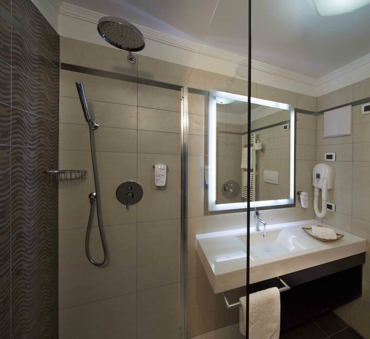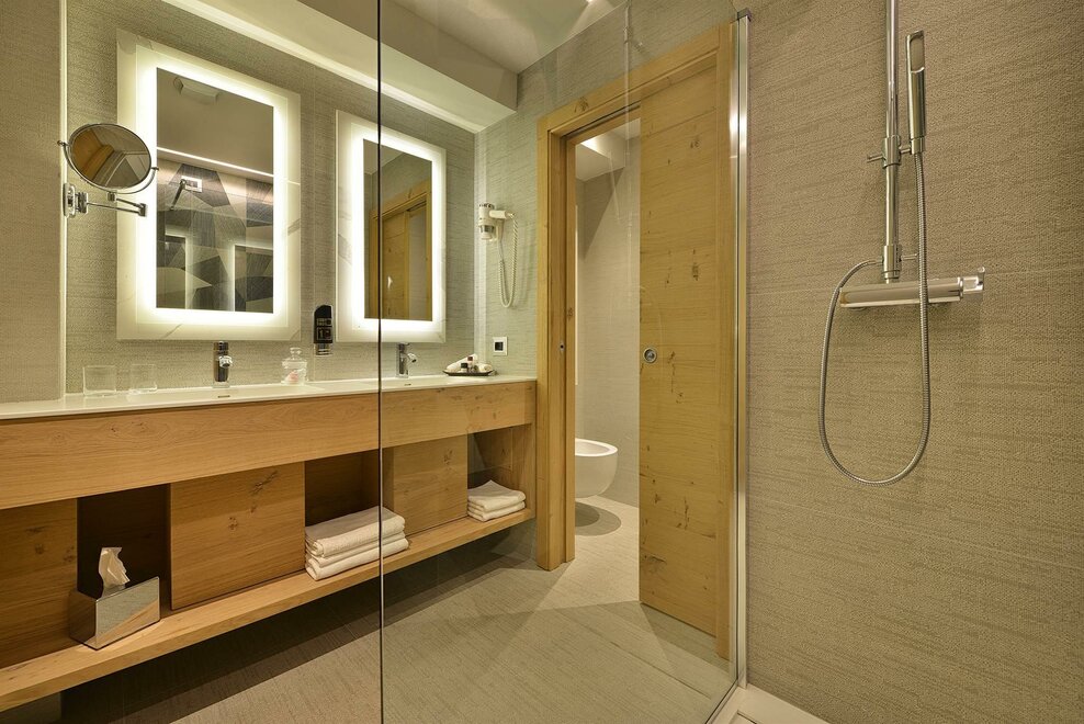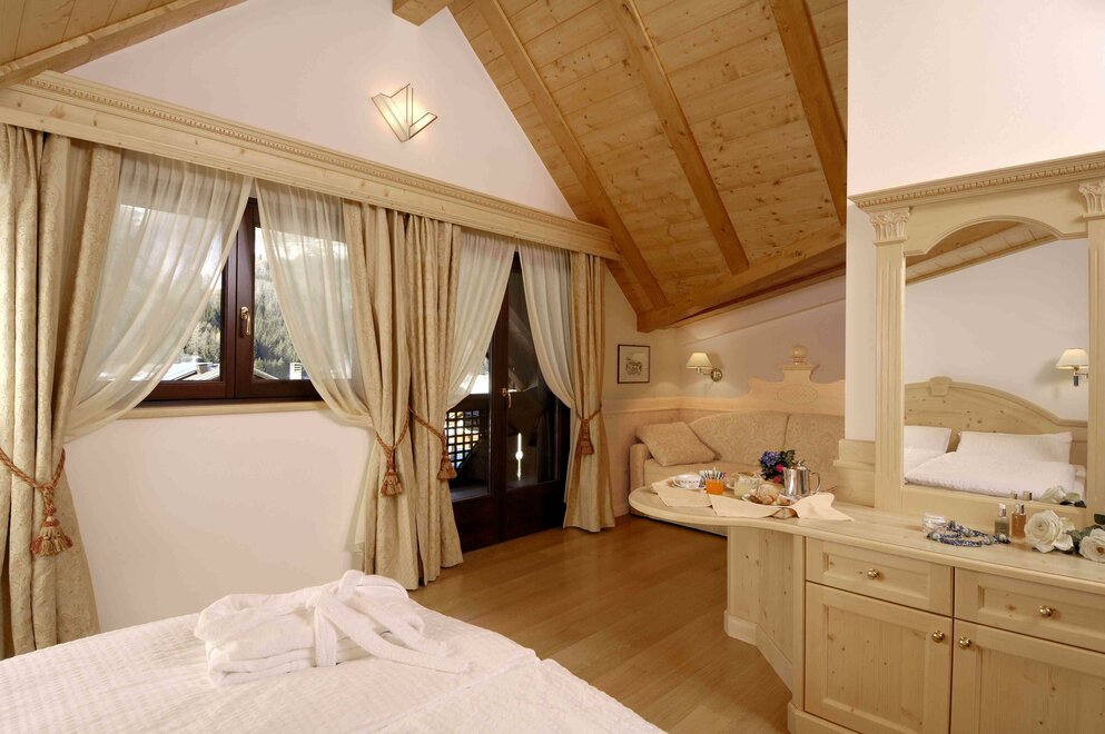 La Junior Suite Dolomite è una camera dal sapore romantico con una suggestiva connotazione alpina. È dotata di balcone interno, un bell’angolo soggiorno con stufa a olle, set per tisane, TV SAT e ampi servizi con doppio lavabo e comoda doccia. Il kit wellness con borsa, accappatoio, morbido telo e ciabattine completa la dotazione. È un’ottima scelta per chi desidera trascorrere momenti indimenticabili con la persona amata in un’atmosfera esclusiva e romantica, nonché per famiglie con bambini.