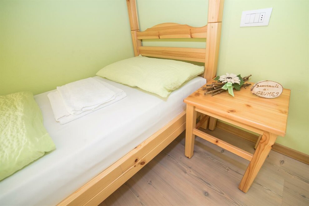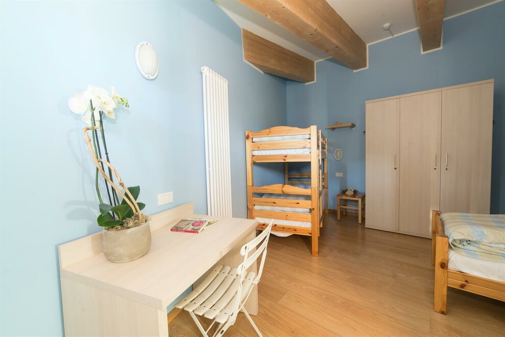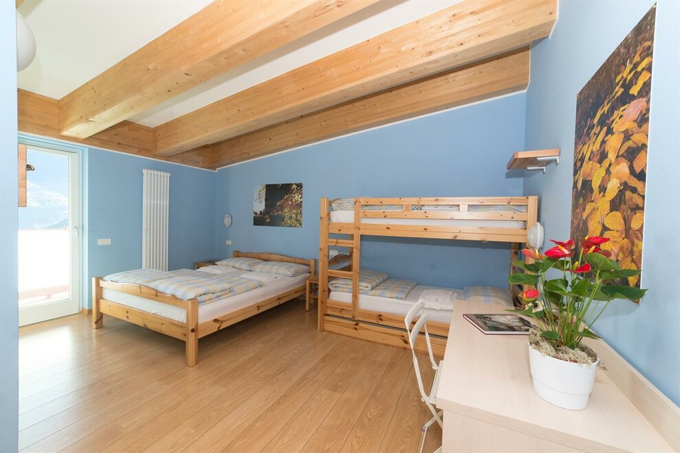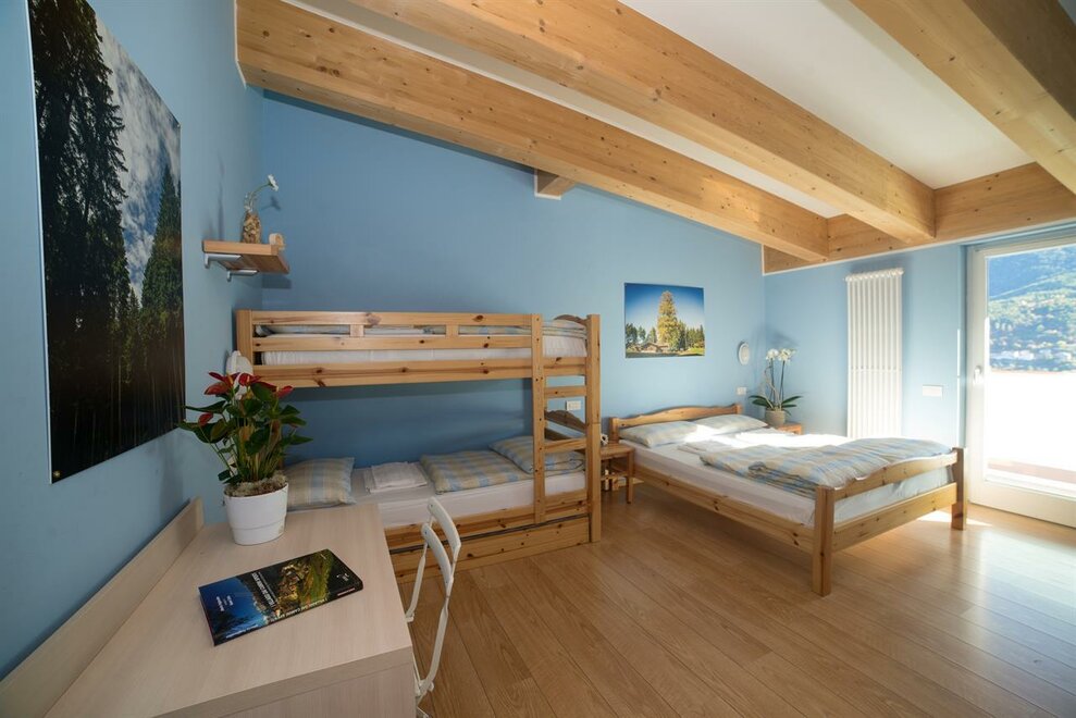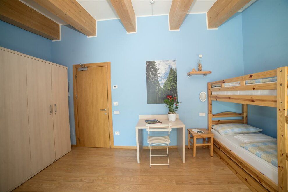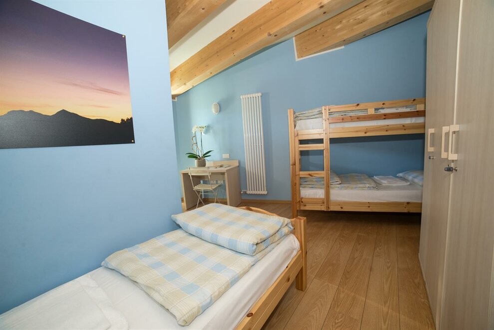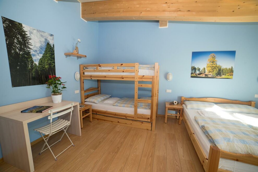 It is composed of a single bed and a bunk bed (plus a pull-out bed that can be added). A cozy and intimate room, with wooden furniture, private bathroom, balcony, free wi-fi.Stanza dell'ABETE - camera tripla.