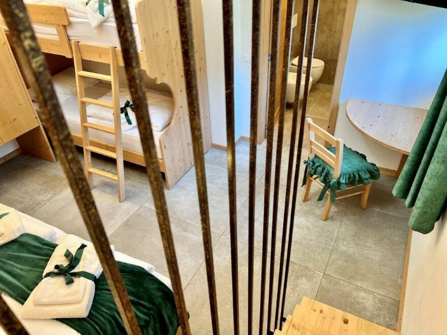 Dispone di un letto matrimoniale (che all'occorrenza si può dividere) un letto a castello (2 posti) e un ulteriore posto letto sul soppalco.