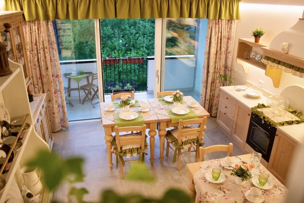 Nella graziosa sala che si affaccia sul giardino viene servita una colazione ricca e gustosa, accompagnata dal canto degli uccellini e dal profumo dei fiori.
