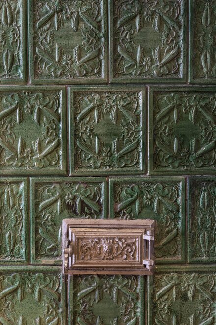 stufa in maiolica del tempo, soffitto di affreschi, quadri antichi.