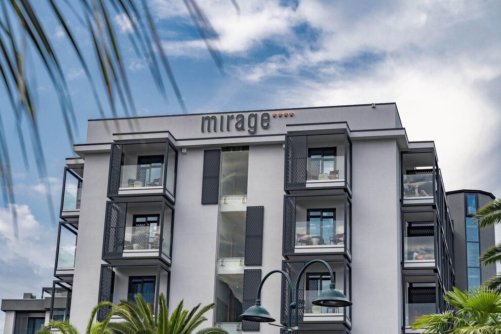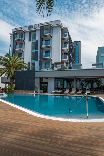 Ristrutturato nel 2021. Legno e colori soft caratterizzano le moderne camere dell'Hotel Mirage, garantendo un'atmosfera di naturale confort. La Spa Lounge con le sue tinte calde è un'accogliente area di relax, ideale per una pausa rigenerante con sauna finlandese, biosauna, bagno di vapore, due vasche idromassaggio, docce emozionale, comodi lettini in tepidarium e un'area bistrot snack. Il Lounge Bar, un salotto moderno con terrazza all'aperto, dove ritrovarsi per l'happy-hour o accomodarsi per un cocktail ascoltando della buona musica di sottofondo. La colazione che soddisfa ogni palato è l'inizio giornata e l'appuntamento con il piacere a vista piscina, anch'essa completamente nuova.
