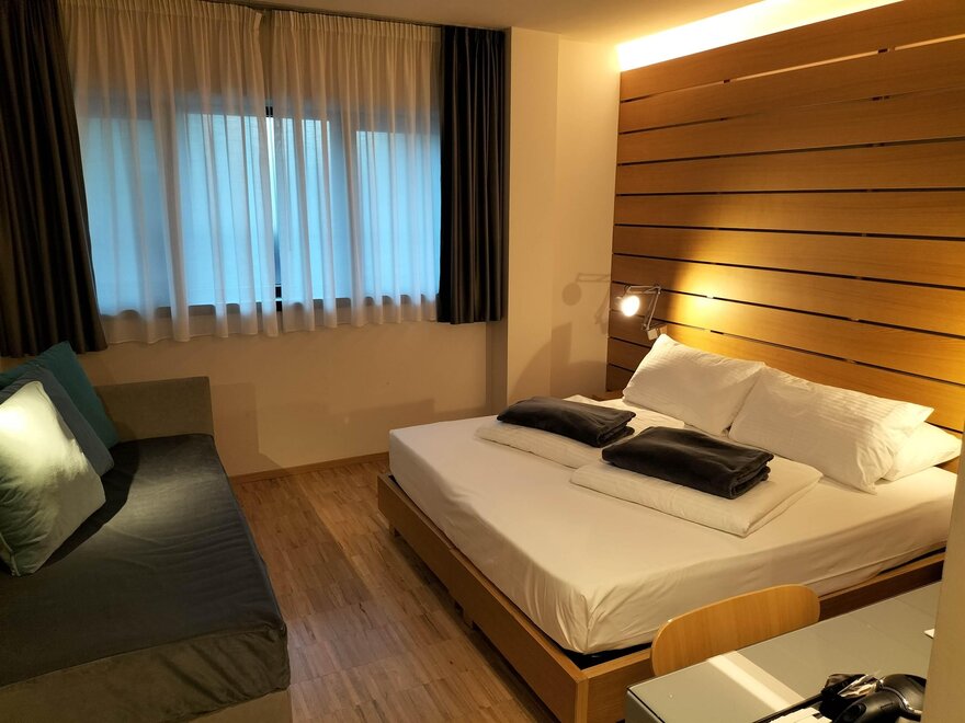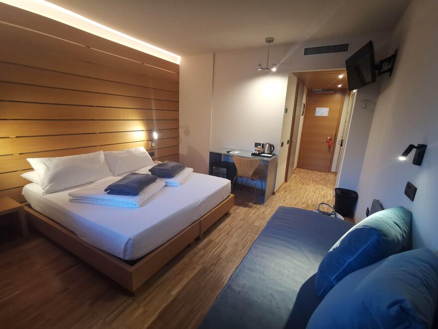 Le camere triple offrono lo spazio e il comfort necessario per trascorrere un soggiorno perfetto in viaggio con amici o in famiglia e dispongono di un letto matrimoniale e una poltrona letto.