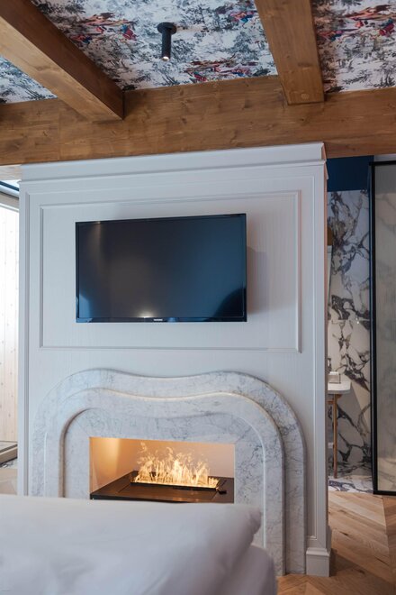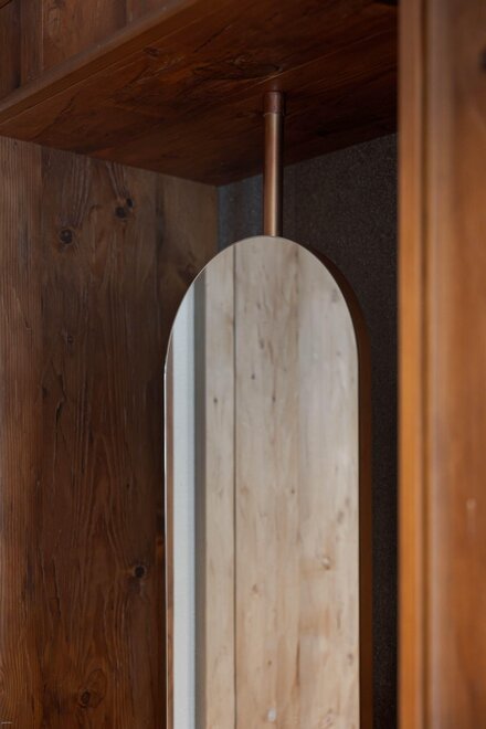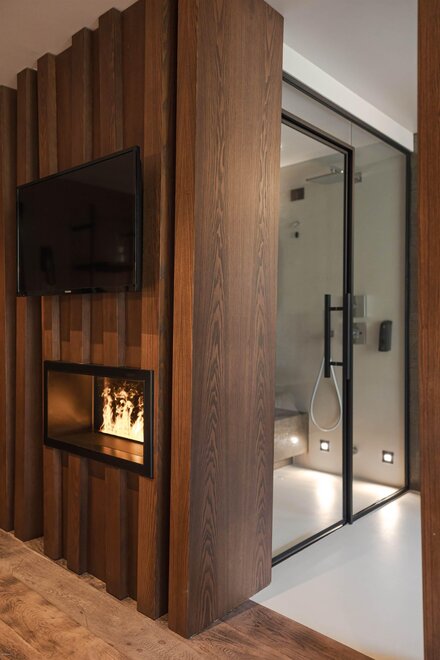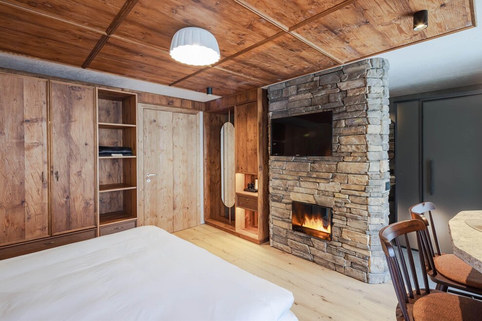 Ispirata alle nostre incantevoli Dolomiti. Il progetto nasce attorno all'affresco dipinto da, Remigio, al quale è dedicata, prende forme e materiali appartenenti al codice ladino. La stanza è calda, realizzata in legno: pareti, soffitti e arredo, sono un insieme di legni di toni e venature diverse.