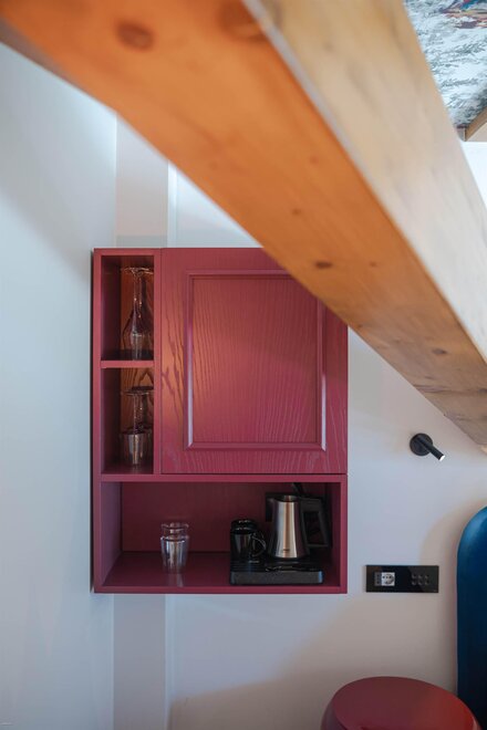 La Suite è un insieme di elementi eleganti, raffinati, seducenti e coinvolgenti. Lo spazio che si sviluppa nel sottotetto del 3 piano dell'edificio Hotel Latemar richiama il sogno. La sensazione è di stare in una pochette. Colori che richiamano la Francia, rosso bianco e blu.