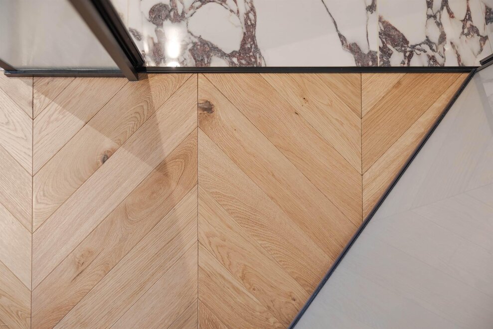 Lavoro raffinato su colori e pattern. Pavimento in legno naturale posato a mosaico intarsiato, composto da quadrotte. Il caminetto scenografico ad acqua in marmo bianco venato si inserisce nella boiserie blu bovary.