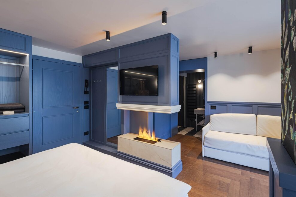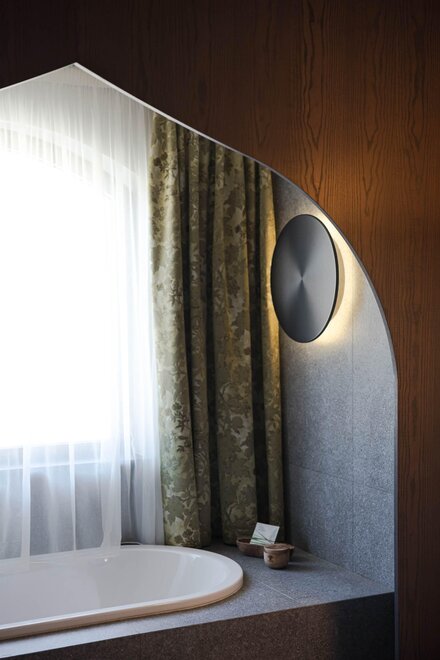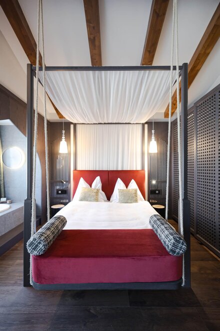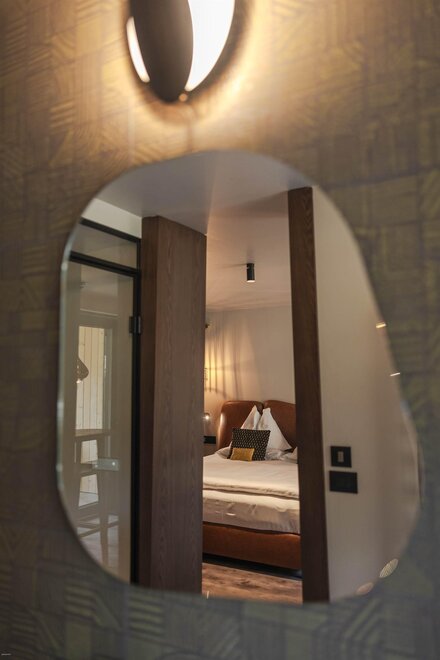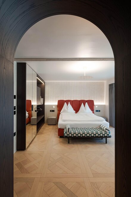 La Suite si trova al terzo piano del Latemar. Lo spazio è diviso in due zone: la stanza e il bagno. Il progetto della stanza inserisce il letto a baldacchino al centro con in fondo un divanetto altalena e la nicchia in pietra con vasca da bagno. Percezione di benessere, cura del corpo e dell'anima.
