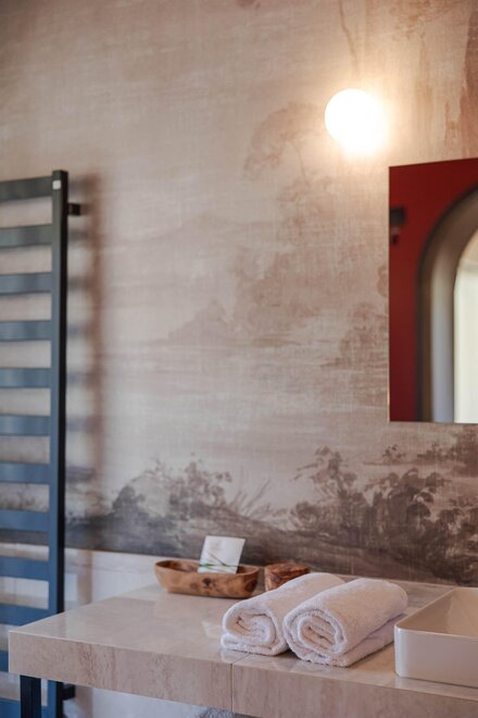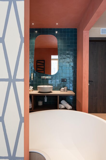 La Suite si trova nella nuova parte dell'hotel, ispirata alle diverse culture del mondo. Gli ambienti infondono calore, energia e tranquillità, ricreando l'atmosfera ideale per una siesta rigenerante. I pavimenti in ceramica colorata, le decorazioni geometriche alle pareti conferiscono dinamismo.