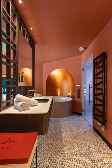 La suite Hammam è un omaggio ai tradizionali ambienti termali arabi. Le decorazioni geometriche, i rivestimenti in ceramica in stile moderno e le decorazioni in legno rievocano l'atmosfera dell'architettura ottomana. Scoprite un ambiente carico di fragranze, vapori e colori, pieno di ardore.