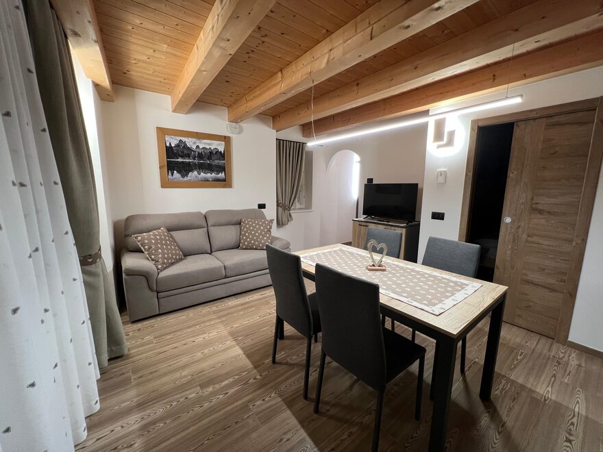 L’appartamento Rododendro è situato al piano rialzato ed è composto da zona soggiorno con divano e cucina a vista, bagno, camera matrimoniale e balcone che rende possibile ammirare dall’alba al tramonto le Pale di San Martino.