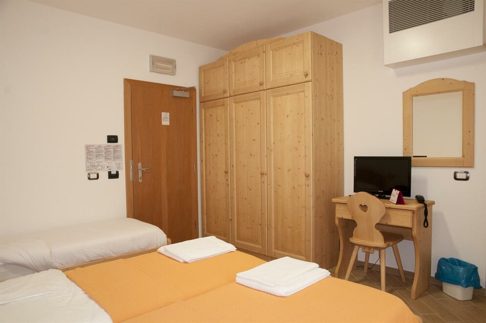 Camera con due letti singoli, dotata di balcone, due armadi, TV, WC e doccia.