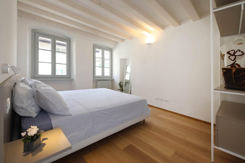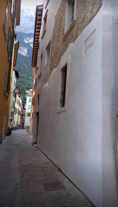 Dimora di 80mq su 2 livelli al II e III piano, con affaccio su via Florida, via centrale del centro storico di Riva che conduce direttamente al lago, composta da ingresso – soggiorno con soffitto decorato con stucchi settecenteschi e affreschi, cucina separata con zona pranzo dal design industriale, scala a chiocciola in ferro che conduce al piano superiore dove trovano spazio 2 ampie camere (una matrimoniale e una doppia), bagno con ampia doccia, il tutto con travi a vista e pavimenti in legno di rovere.