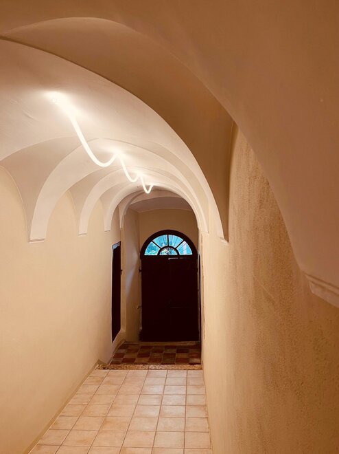 Le facciate, le parti comuni e le dimore presentano i tratti distintivi di un tempo: la facciata ad est è caratteristica dei palazzi nobiliari del Settecento, mentre sulla facciata sud è ben visibile una bifora risalente al 1400; l’ingresso con avvolti e l’antico pozzo; i soffitti decorati a stucco, pittura e affreschi; i caminetti in pietra e le antiche stufe a olle e a carbone. Il tutto sapientemente affiancato e amalgamato ad elementi di design e comfort moderni.