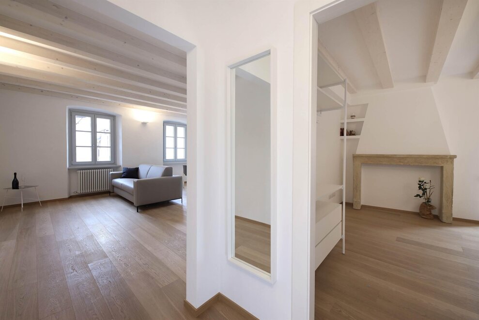 Tutto l’appartamento presenta soffitto con travi in legno a vista e pavimento in legno di rovere.