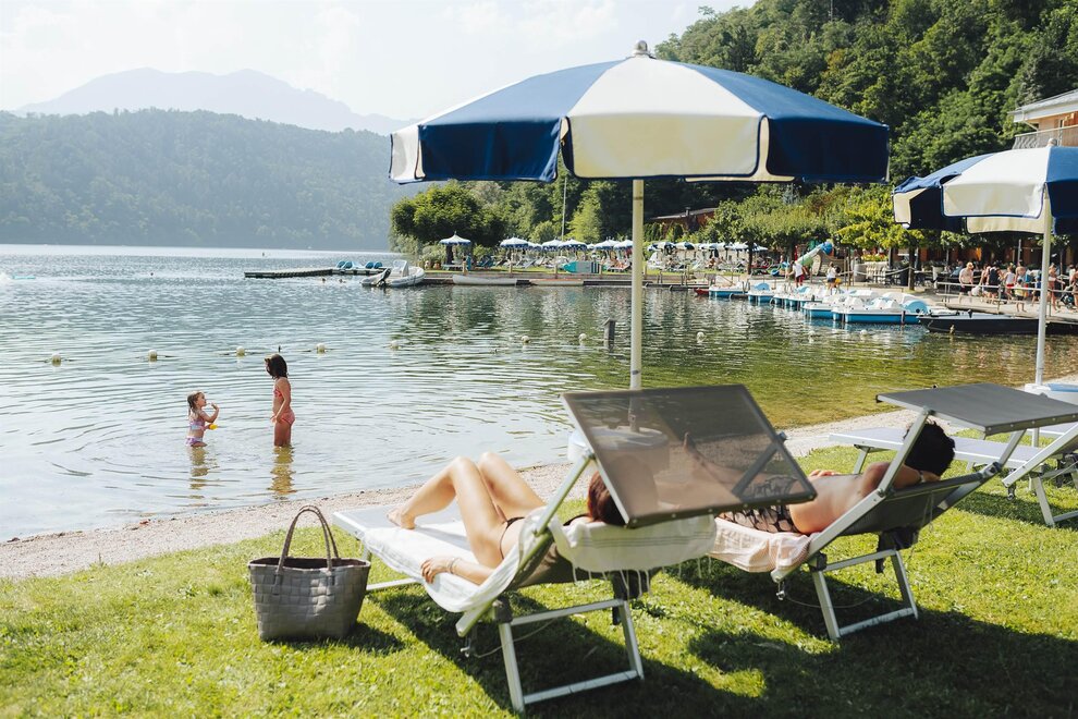 - Una spiaggia privata attrezzata con pontile sul lago, area giochi e piscina esterna con scivolo per bambini