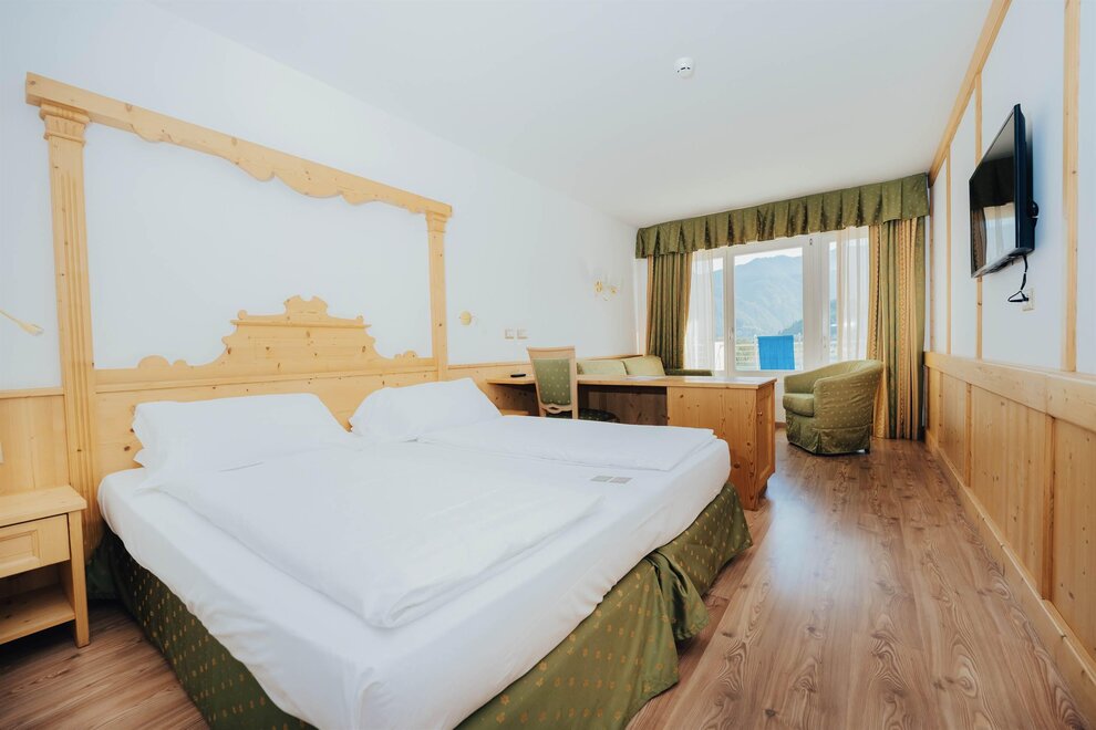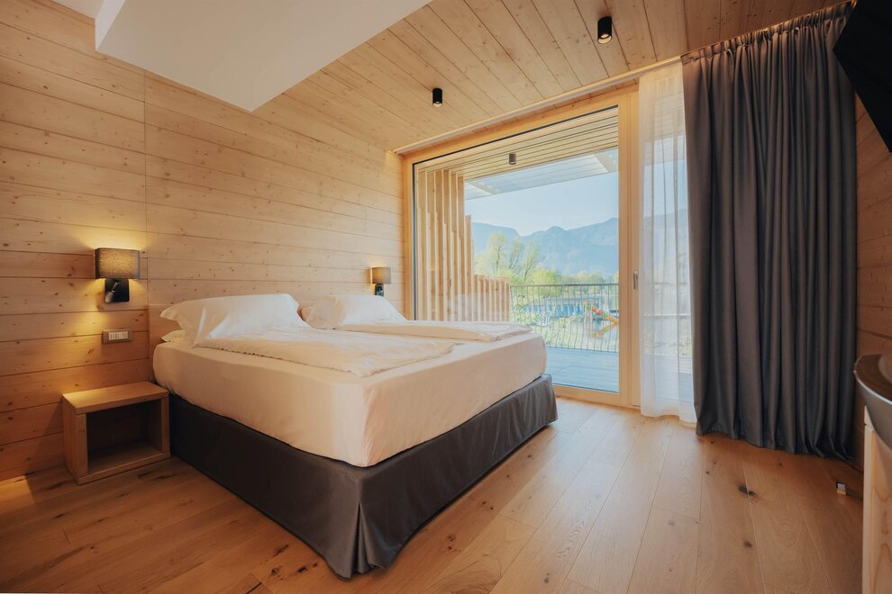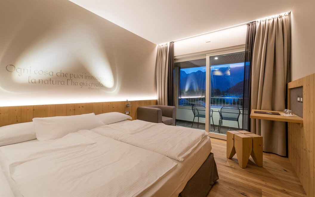 La struttura dispone di 63 camere e suite, tutte spaziose e dotate di terrazza con vista lago, arredate in stile alpino per garantire comfort e tranquillità.