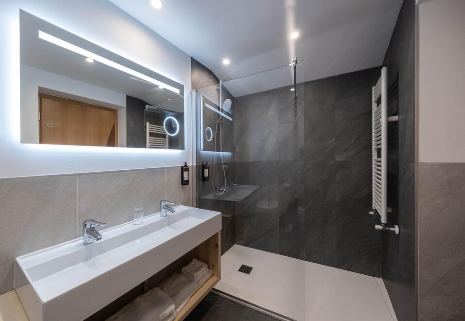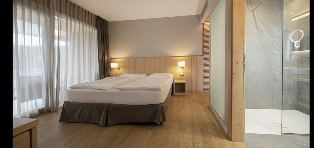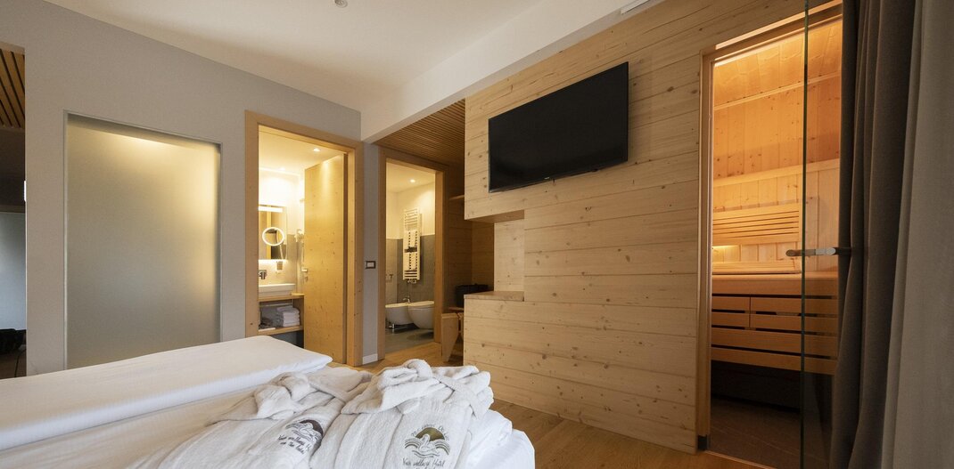 CA. 60 M² La Wellness Suite "Du Lac" è un gioiello. La suite in stile alpino si trova nell'edificio principale. La camera è dotata di: - un ampio soggiorno con angolo salotto e stufa - camera da letto separata - due stanze da bagno - una sauna a infrarossi privata - doccia emozionale - ampio terrazzo ammobiliato con vista sul lago - TV LCD da 22“, frigo, telefono - WiFi, cassaforte, asciugacapelli, aria condizionata. E’ interamente arredata legno pregiato recuperato da una vecchia baita d’alta montagna.