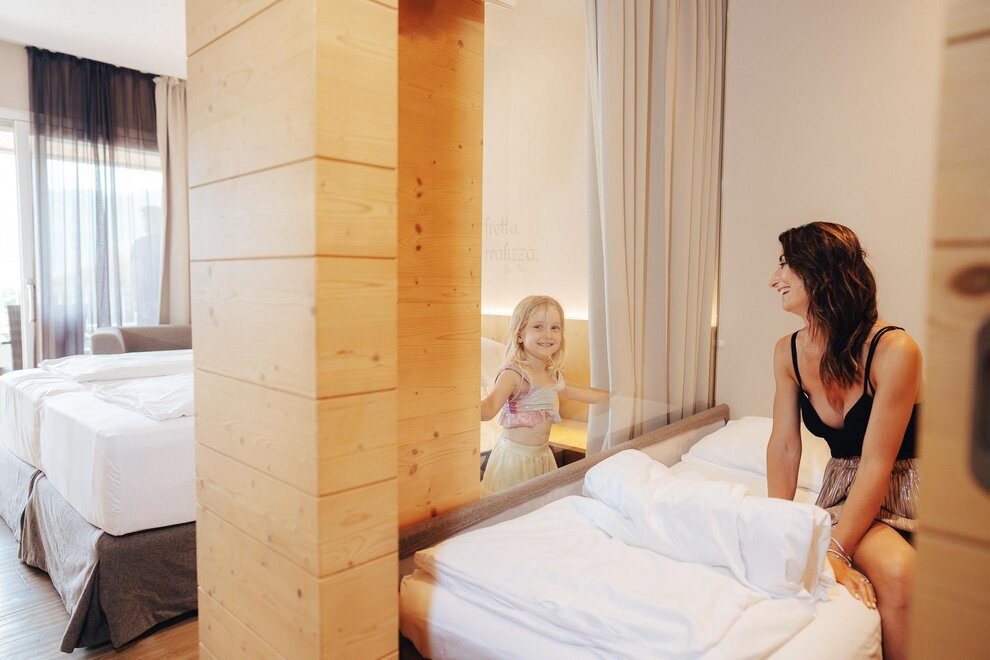 Le Family Junior Suite in stile alpino o in stile classimo si trovano nell'edificio principale e si affacciano sul lago. Queste suite con 2 zone notte separate sono l'ideale per le famiglie con i bambini. La camera, di ca. 45mq., interamente arredata in legno con uno charme particolare, è dotata di: - 2 zone notte separate, divise da una porta - balcone ammobiliato con vista sul lago - TV LCD da 22'' - frigo, telefono - WiFi, cassaforte, asciugacapelli, aria condizionata, moquette oppure legno. Le Family Suite classiche hanno il letto a castello in cameretta.