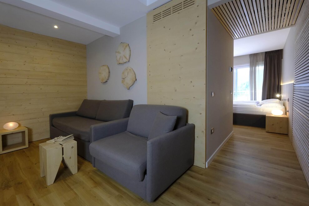 L’arredo delle Family Wellness Suite (50 mq) è in stile alpino e molto curato. Particolarmente adatte a famiglie con bambini, dispongono di 2 zone notte separate da una porta e una terrazza da cui si può godere una magnifica vista sul lago. Sono dotate di tutti i comfort, tra cui una sauna privata, TV LCD 22’, telefono, connessione wireless, asciugacapelli, cassaforte e aria condizionata. È situata nel corpo principale dell’hotel al quarto piano.