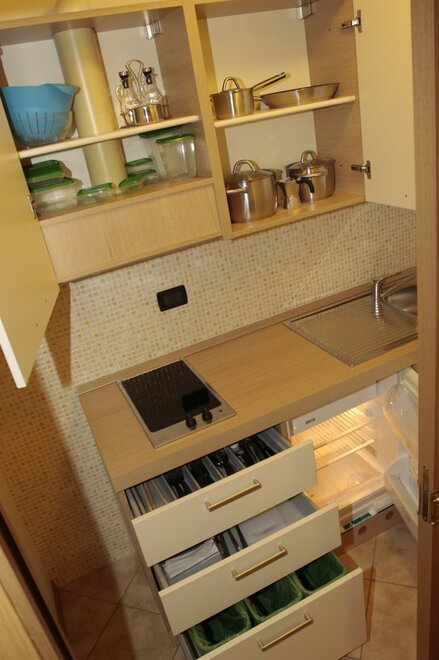 Monolocale con letto singolo, camera e soggiorno insieme, vano cucina dotato di piano cottura, lavello, frigo, pentole e stoviglie. Bagno attrezzato con doccia, phon. Balcone vista montagna, biancheria per la camera e il bagno, tv led, cassaforte, collegamento internet wi-fi gratuito.